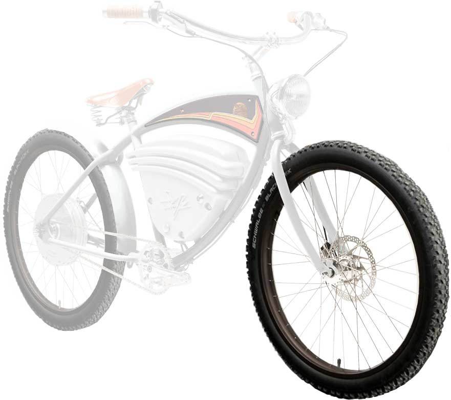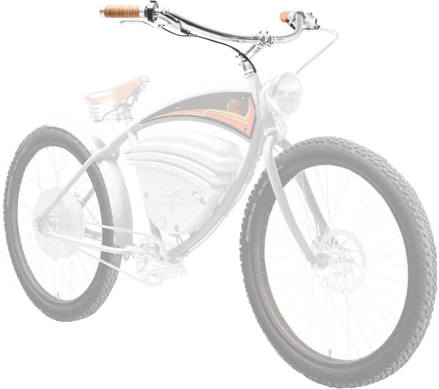 Ravno zaradi plaže in peska ima Vintage Electric Jeff Clarke Signature Cruz robustne pnevmatike Schwalbe Black Jack, ki imajo vgrajeno zaščito pred predrtjem pnevmatike Kevlarguard. Sedež, ročke in deli okvirja kolesa so oviti v vrhunsko usnje Brooks, kar še poveča “vintage” občutek. Vpliv Jeffa Clarka je še dodatno opazen na preoblikovanju električnega kolesa, saj imamo na voljo odstranljiv nosilec za surf desko, nosilec za prtljago na zadnjem delu kolesa in toplotno izolirane torbe, ki jih lahko uporabljamo tudi kot neke vrste hladilnik.