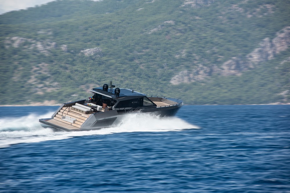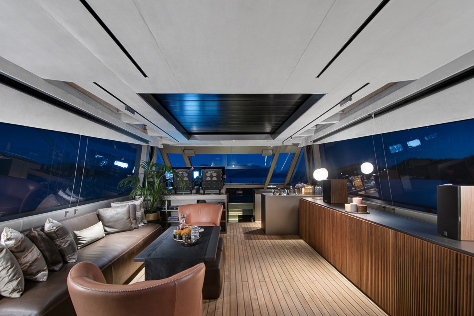 La cabina sul ponte è a forma di serra, di fronte si trova una terrazza più ampia e polivalente e gradini terrazzati con sedili incorporati che conducono all'acqua. Guidano lo yacht tre motori Volvo Penta, e il suo scafo in carbonio può navigare a velocità fino a 40 nodi.