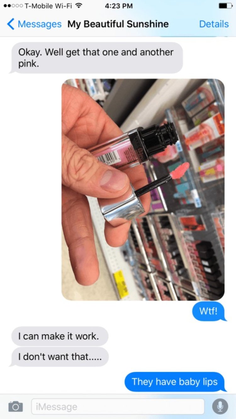 È una prova pogovor dekleta in njenega fanta (Imgurjevega uporabnika Bluefiz), ki se ponudi, da ji nakupi zalogo kozmetike in ličil, češ da bo nalogi kos, a kot se kmalu izkaže, ji še zdaleč ni dorasel. Smeh zagotovljen!