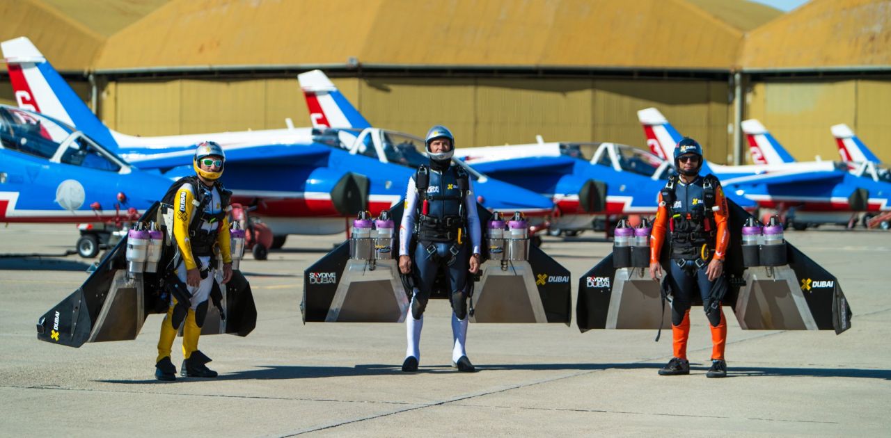 ジェットパック、翼のついたスーツ、 さらに二人の命知らずのパイロットと一緒に ヴィンセント・レフェットとフレディ・フューゲン、艦隊と一緒に飛行します アルファジェット機 世界最高の曲技飛行グループの一つ(双発ジェット訓練軍用機)が接近 ほんの数メートル離れたところに、これはジェットパックの制御を考慮すると驚くべき偉業です 体の傾きだけで.