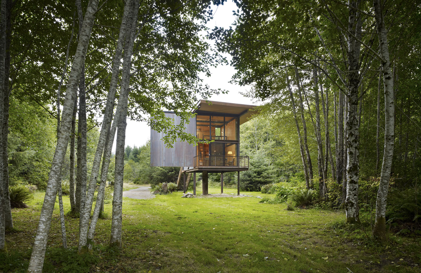 フライフィッシング愛好家のオルソン・クンディグは、建築家に「夫婦でフライフィッシングに出かける際に住むための、コンパクトでメンテナンスが容易、そして一見壊れなさそうな家」の設計を依頼した。完成したのは、小さくも風格のある小屋で、夫婦がフライを探しに出かける間は、スチール製のシャッターを簡単に施錠できる。