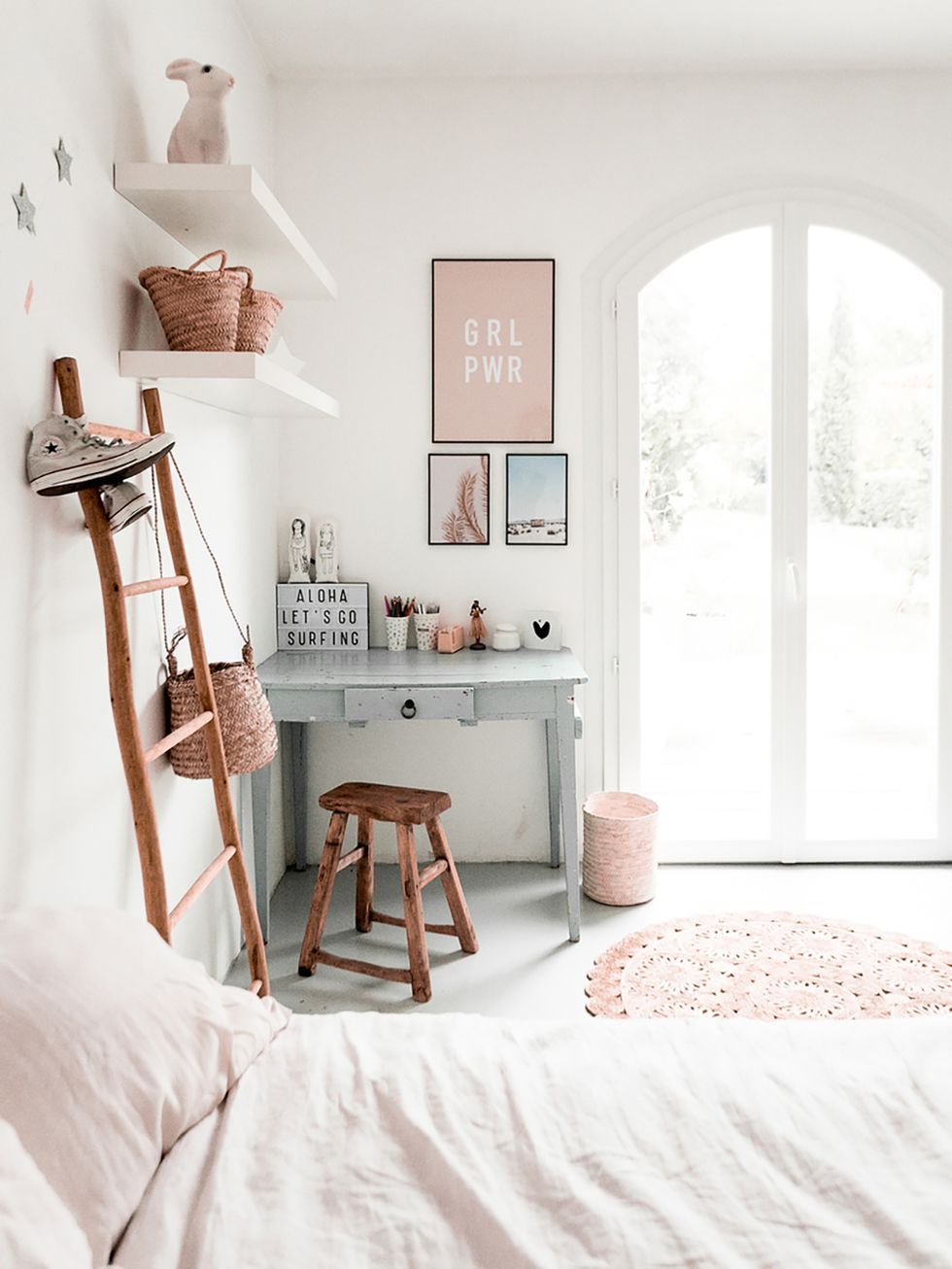寝具: 寝具の色や柄もお部屋の印象に影響します。好みはさまざまですが、子供用の寝具のプリントは最もファッショナブルに見えない傾向があります。壁紙、壁、棚、写真と一致する無地の寝具を選択してください。
