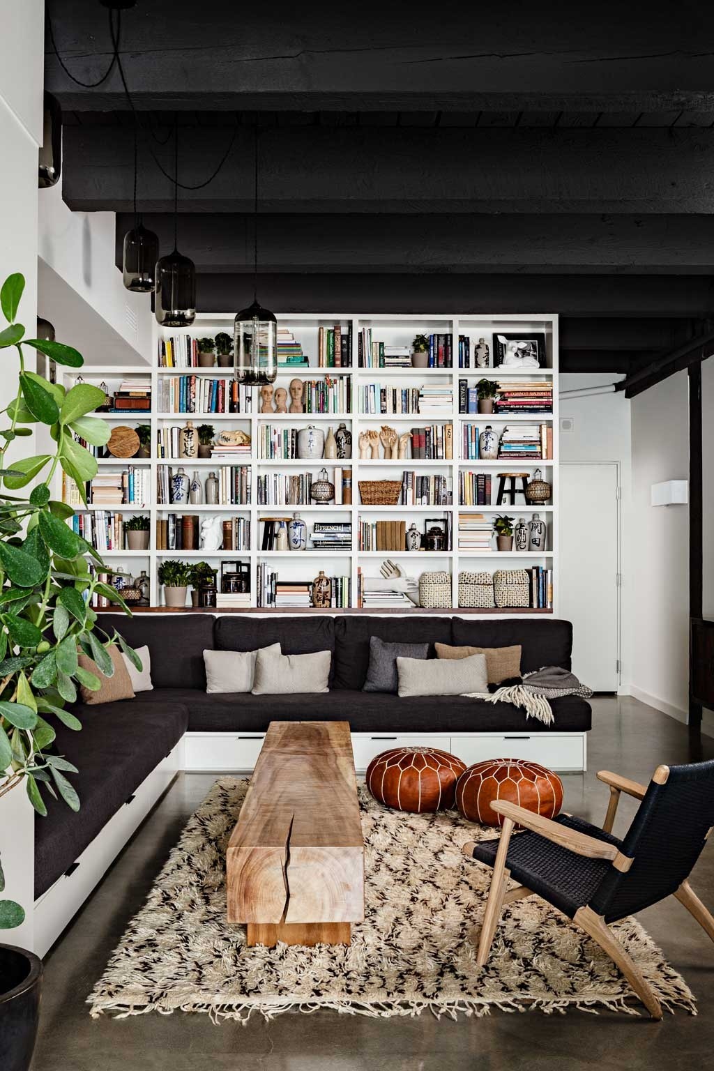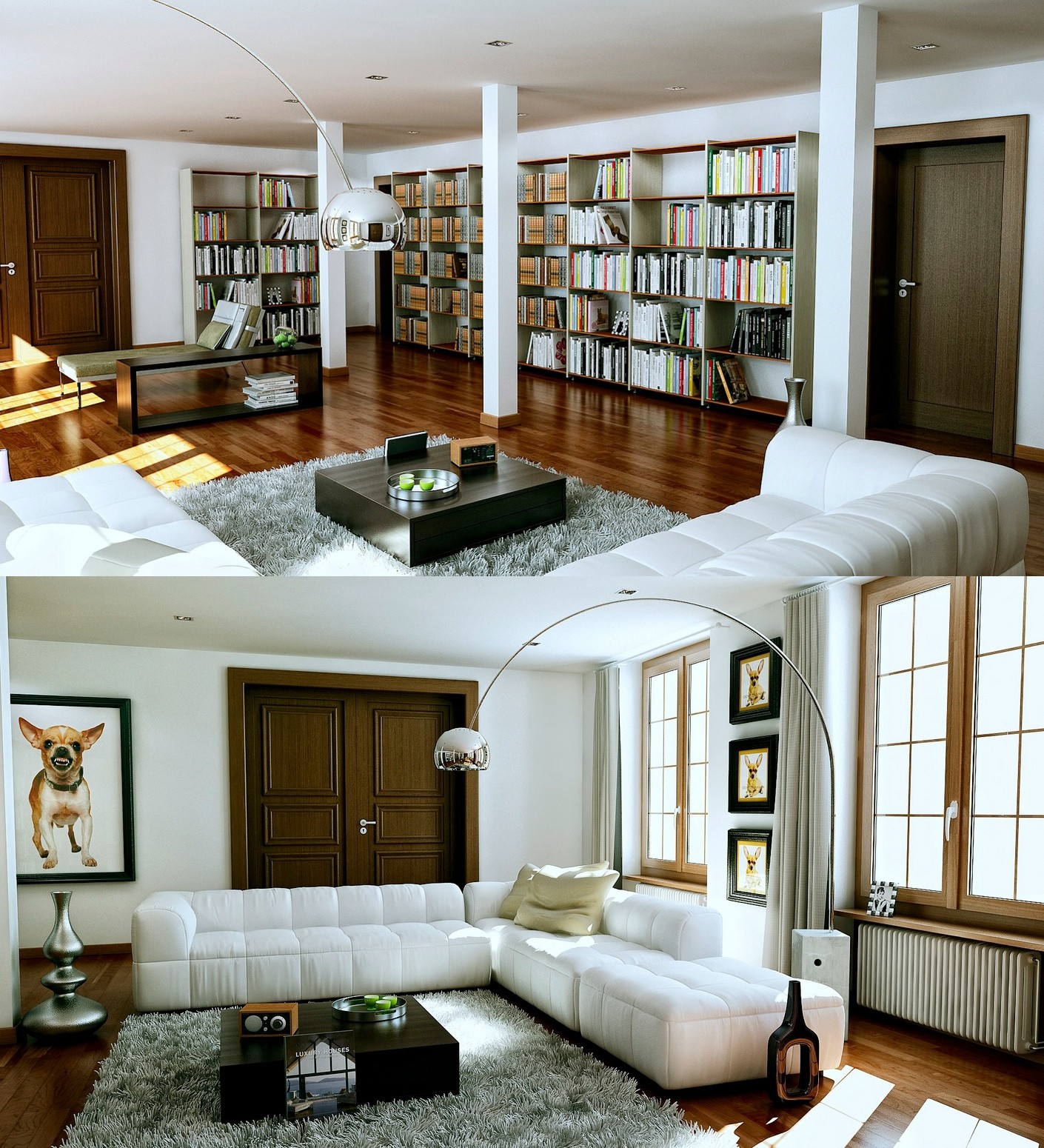 家のアイデア: 本棚のあるリビングルーム