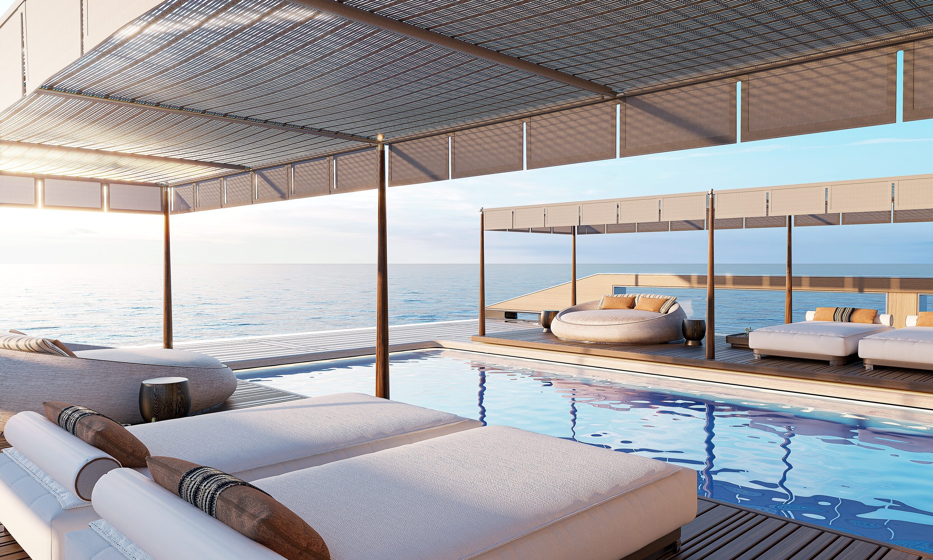 サンダー・J・シノットこの驚異の背後にある天才である彼は、AWARE の「スペースの豊かさ」を強調しています。そして彼は間違っていなかった。 230 平方メートルのビーチと長さ 11 メートルのプールを備えたこのヨットは、実際には水上リゾート複合施設です。ビーチクラブだけでもすでに 121 平方メートルのスペースを提供しています。それはほとんどのタウンハウスよりも大きいです!