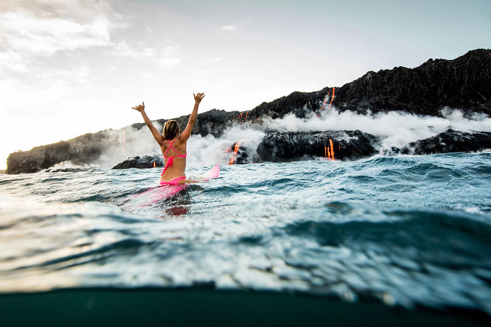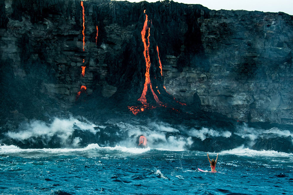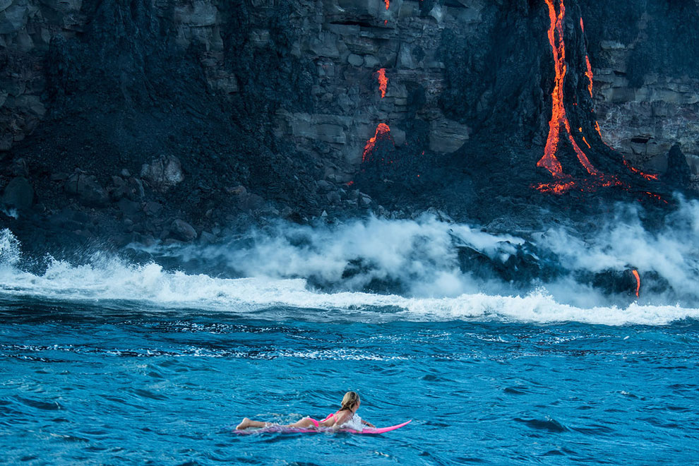 Eden od takih je bilo tudi surfanje v neposredni bližini aktivnega ognjenika Kilauea in lave, ki se je vila v morje.