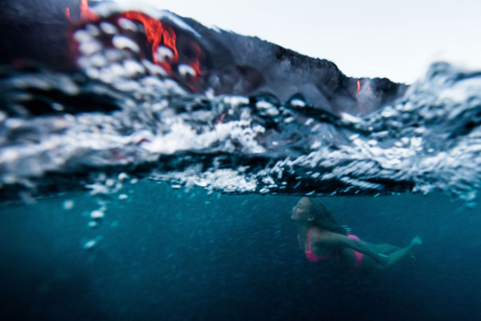 女性版インディ・ジョーンズとしても知られる冒険家のアリソン・ティールは、噴火中の火山のすぐ近くでサーフィンをした史上初の女性となった。驚くべき映像はハワイ、より正確に言えば、世界で最も活発な火山の一つであり、30 年以上 (1983 年以来) 活動しているキラウエア火山のすぐ近くからのものです。溶岩は海に流れ込むことが多く、この素晴らしい景色を利用して見事な写真を撮ったのはアリソン ティールでした。これらは水中写真家のペリン・ジェームスによって撮影されました。