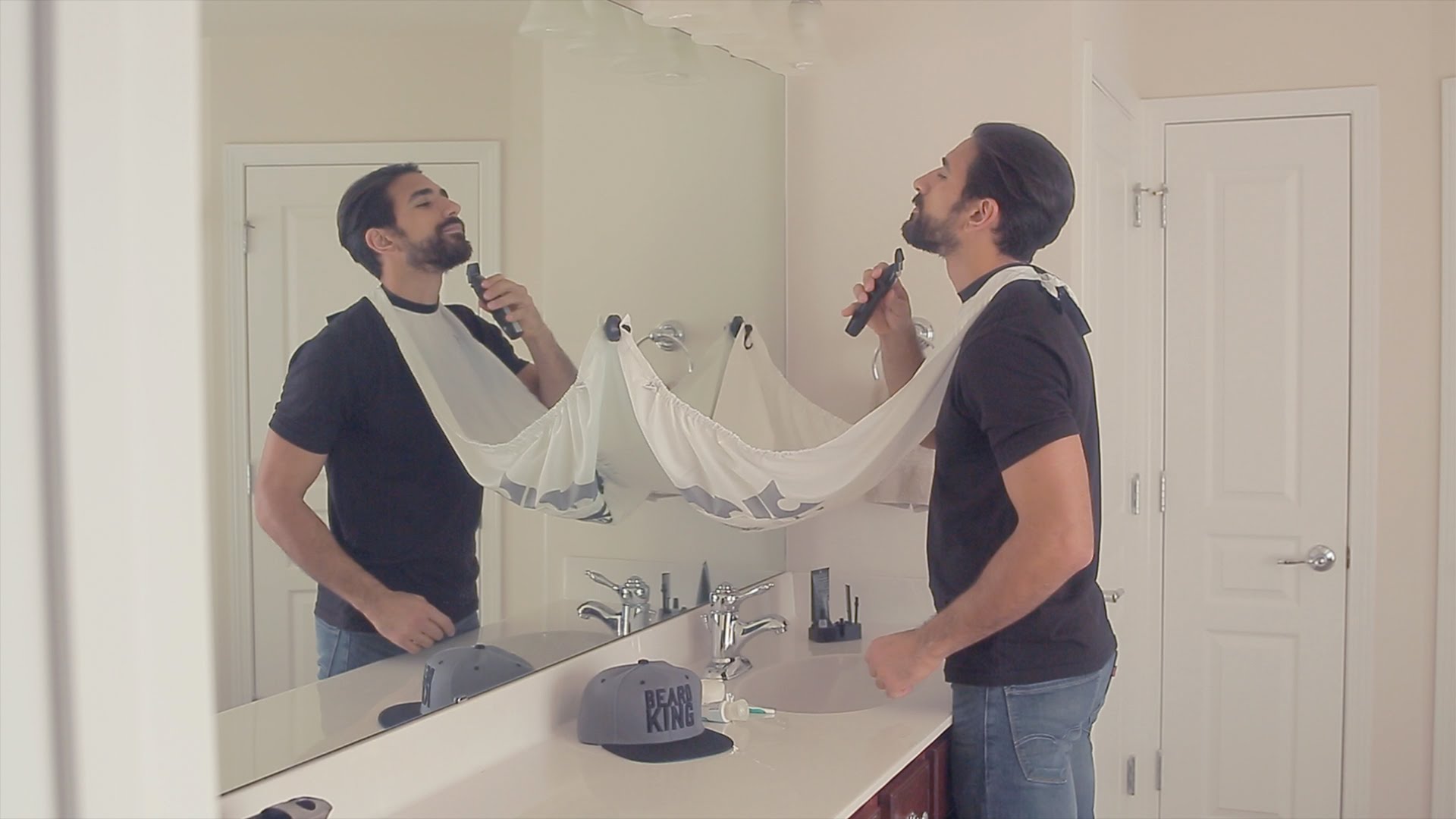 Beard Bib 企業 Beard King また slinček za brado, kot mu tudi pravijo, čeprav se ne sliši ravno moško, omogoča, da dlačice zaradi britja ali pristrigovanja bradne ne bodo končale po celi kopalnice, ampak se bodo lepo ujele v slinček, ki si ga na eni strani pripnemo okoli vratu, na drugi pa ga s seskoma pričvrstimo na ogledalo, s čimer ustvarimo lovilno površino za kocine. Po koncu britja dlačice preprosto stresemo v koš za smeti.