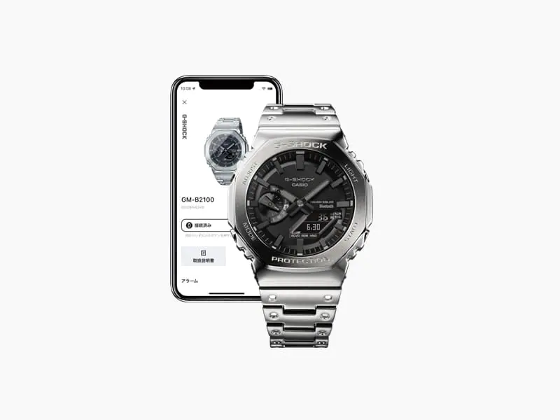 カシオ Gショック GMB2100 は、成功を収めた G-Shock GA2100 モデルの堅牢な金属製の「アップグレード」です。 GMB2100 腕時計は、動力となるクォーツ ムーブメントを接続します。 太陽 伝統的なアナログ ダイヤルの下に高度な電子ソリューションが多数隠されています。この時計は、38 の有名都市のワールドタイム、最大 5 つの毎日のリマインダー、ストップウォッチ、カウントダウン タイマーを表示し、アプリとの Bluetooth 接続を介して、時計は 1 日 4 回自動的に正確な時間を確認して設定します。