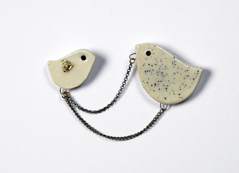 Pomlad bo vsak čas pričivkala v naše kraje, na kar nas je spomnila tudi oblikovalka keramičnega nakita Hana Karim. Nedavno se je v Lični hiši predstavila s prodajno razstavo Expo, svoj kotiček je imela tudi na mesecu oblikovanja. Zaljubili smo se v njeno kolekcijo fORMINORA, kjer spretno združuje grobo z nežnim in robustno z lahkotnim. Keramiko, ki sicer ni ravno značilen material za nakit, namreč dopolnjuje s perjem in nitkami, kar prstane, ogrlice in broške prelevi v svojevrstne strukture. V gnezdo kolekcij unikatnega nakita Hana Karim so zdaj prileteli še ljubki ptički, ki jih bomo kot broške nosili na svojih najljubših oblačilih. Ptički se pogosto družijo v parih ali jih spremljajo srčki. So prijaznih oblik in pisanih barv: na plaščih, jaknah in puloverjih bodo čivkali v zlato rumenih, bordo rdečih in odtenkih petroleja, z zlato obarvanimi krilci. V njihovi družbi bo razposajena pomlad vedno z nami, četudi bo zunaj še vedno vztrajala teta zima.
