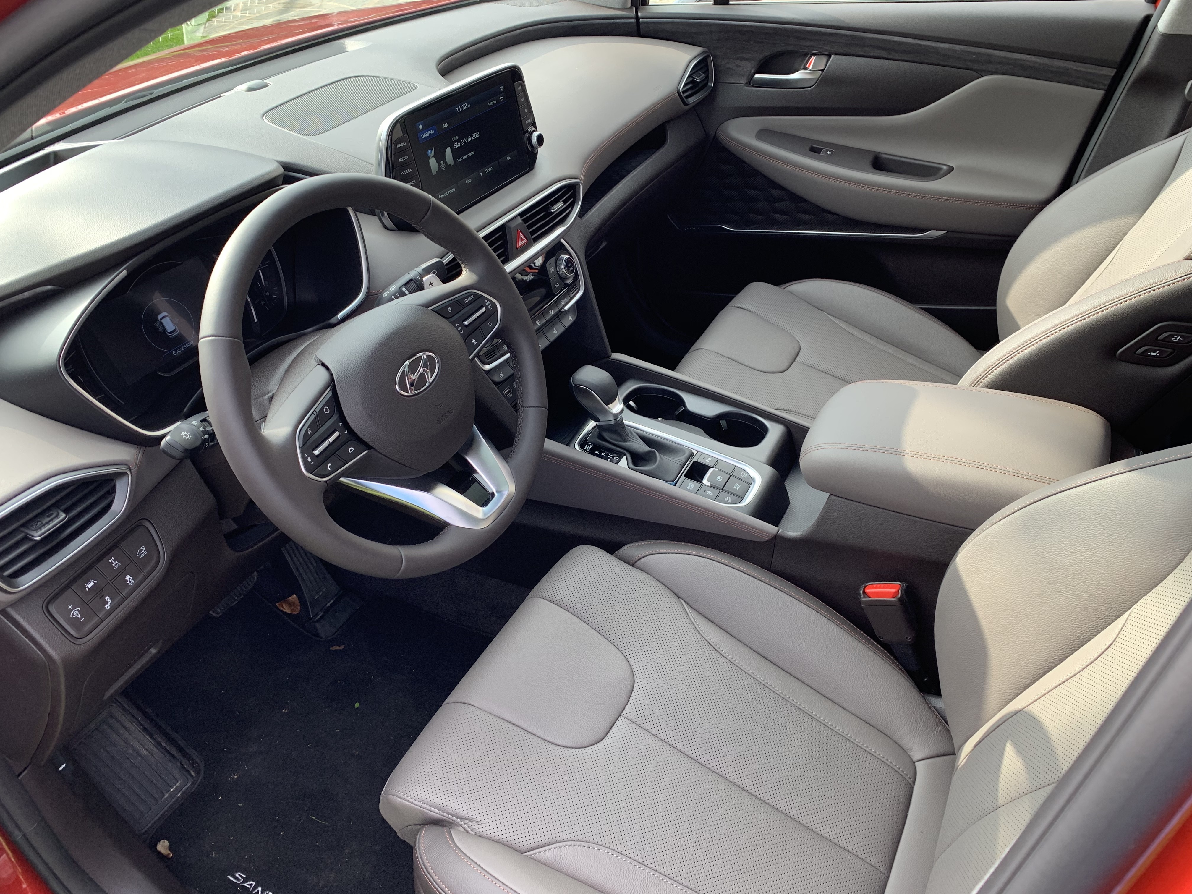 Notranjost potniške kabine si lahko omislimo v 四 različnih barvah, opazna pa je izboljšava uporabljenih materialov in večja kakovost izdelave notranjosti. Sredi armaturne plošče se nahaja tako imenovani lebdeči 画面 na dotik, ki je na voljo v velikosti 5- , 7-、 また 8インチ, glede na nivo izbrane opreme. Prtljažni prostor se je povečal za 40 litrov, vanj pa lahko po novem spravimo za 625リットル prtljage. Zadnja bočna stekla imajo za kar 41% večjo površino, kar pomeni, da se je 透明性 izdatno izboljšala. Hyundai Santa Fe je na voljo s 5時までに また sedmimi sedeži.