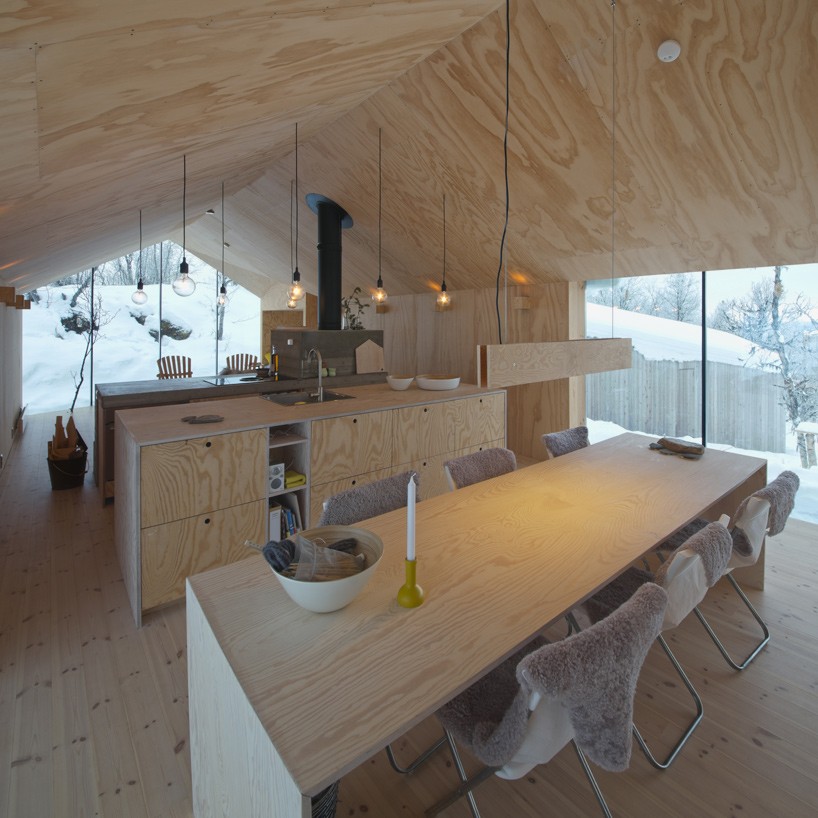 Lesena zimska koča “V”, ki jo najdemo na nižji vzpetini centralne Norveške, je primerna za udobno življenje pet članske družine v vseh letnih časih, arhitekte biroja Reiulf Ramstad Architects pa lahko obtožimo za njen inovativen tloris, ki spominja na črko v. Takoimenovana koča “V” je svojo obliko dobila po zaslugi oblike zemljišča, na katerem je zgrajena, saj je le-to razdeljeno na dva dela, ki sta združena pod kotom 45 stopinj. Notranjost lesene zimske koče je tako razdeljena na dve krili. Prvo obsega prostorno kuhinjo in dnevno sobo, medtem ko v drugem najdemo več zasebnih sob s steklenimi stenami, ki ponujajo čudovit pogled na mirno naravo.