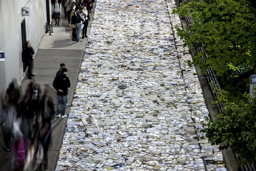 トロントのヘイガーマン・ストリートでは、ランダムな通行人が珍しい光景に遭遇した。公共スペースへの介入で有名なスペインの匿名アート グループ、Luzinterruptus (私たちのプロストロジェフカに似ています) は、1 万冊の本で通りを埋め尽くしました。