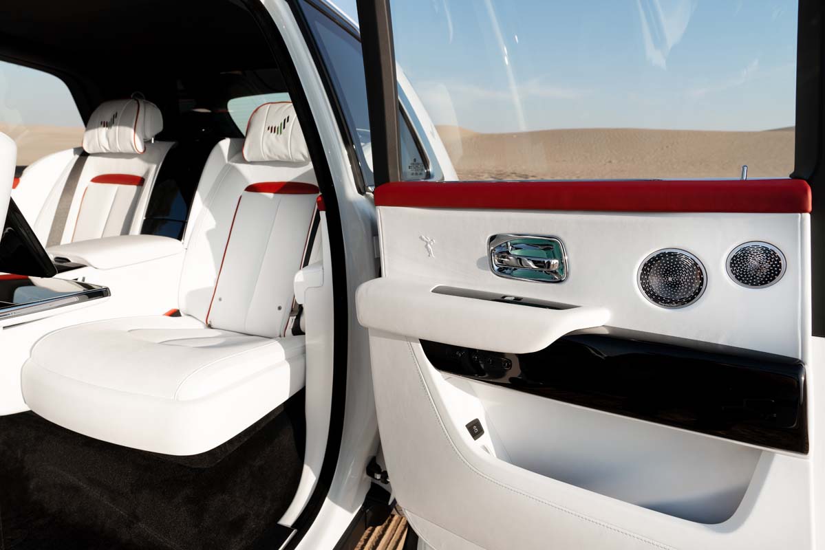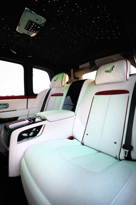 Veliko delov karoserije je prevlečeno a ʺposlikavoʺ, ki nas spominja na granit, oziroma 大理石. Malce nenavadno za luksuzni avtomobil, a kljub vsemu dobro izpade. Podobno barvno shemo najdemo tudi v notranjosti, poleg tega pa še kombinacijo belega in črnega usnja. Na vzglavnikih je izvezen obris ZAE. Mansory je Cullinana tudi tehnično nagradil in ima zdaj 619 konjskih moči と 950 Nm navora. Na žalost nam številke o zmogljivosti niso znane, prav take tudi ne, koliko predstavljeni prestiž stane.
