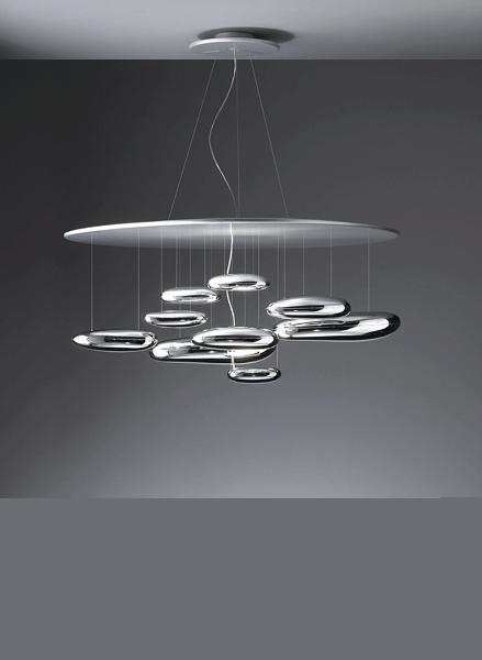 Svetilo, sestavljeno iz devetih velikih svetlobnih teles, ki visijo na aluminijastem disku premera 110 cm, prinaša v prostor igro modernih oblik in svetlobo, podobno naravni. Posamezno telo je dobilo obliko v posebnem postopku oblikovanja, kakor tudi značilno krom ali satin aluminium barvo. Kljub trdni obliki “kovinski kamni” zaradi odbijanja svetlobe delujejo, kot da neprestano z lebdenjem v prostoru spreminjajo obliko, podobno kot kapljice živega srebra ali kakšne druge tekoče kovine. Svetlobo oddajajo indirektno, kar v prostor prinaša mehkobo in toplino. Za znano italijansko hišo svetil Artemide je svetilo Mercury zasnoval oblikovalec Rosso Lovegrove kot skulpturo, ki se ob večerih spremeni v planetarij svetlobne igre. Ker gre za relativno veliko viseče svetilo opazne oblike, ki spominja na galaksijo, bo nedvomno postalo središče bivalnega prostora. V kategoriji best of the best je Mercuri Sospensione dobitnik nagrade 赤い点.