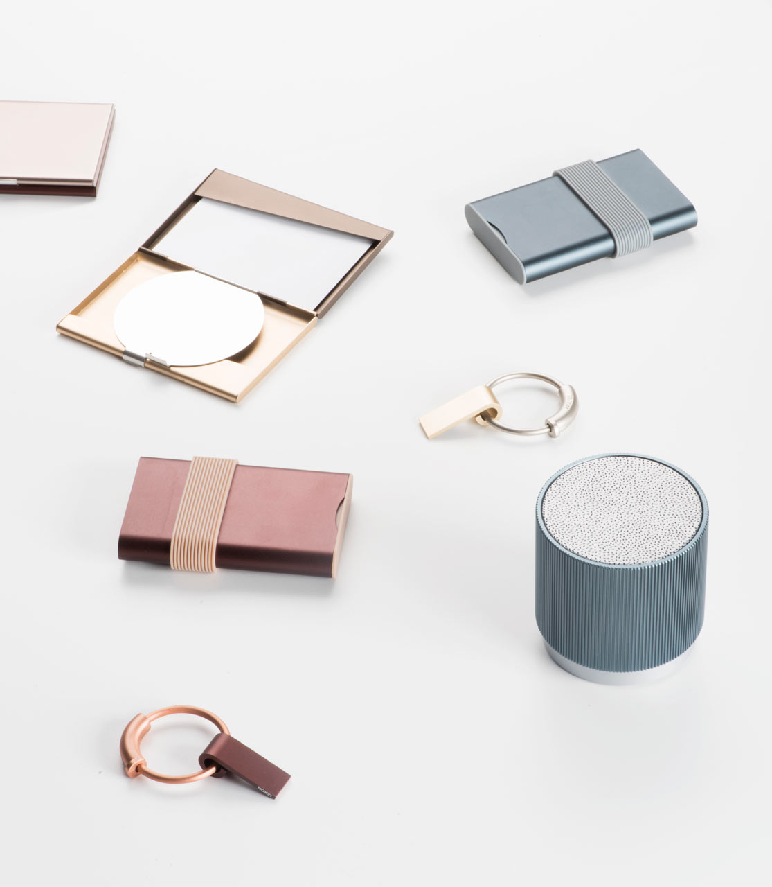 Pauline je pri oblikovanju združila potrebe delovnih in urejenih žensk, saj kolekcijo, ki sestoji iz brezžičnega zvočnika, prenosnega polnilca, USB ključka in držala za vizitke, prevevajo versatilnost, nežnost in predvsem ženstvenost. Držalo za 名刺 na primer služi tudi kot ogledalce, v katerem lahko med hitenjem po opravkih preverimo svoj make up…
