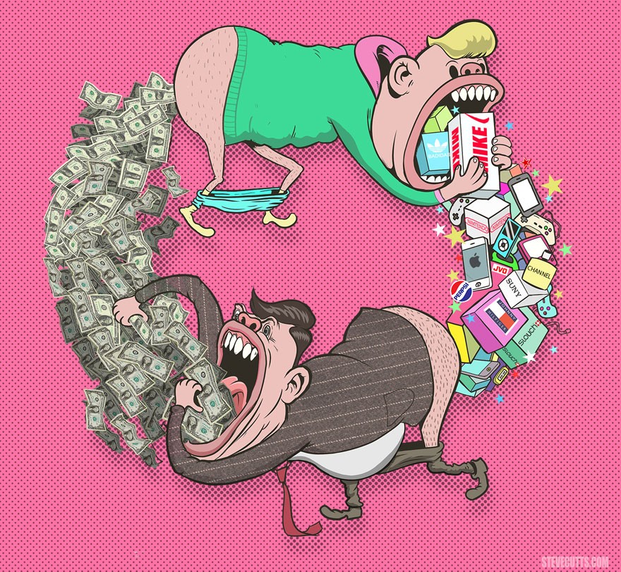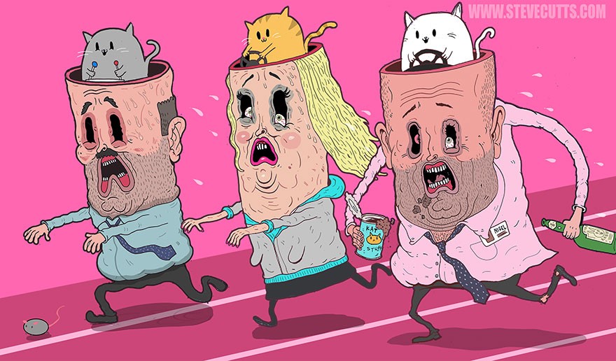 Steve Cutts meni, da naše delo ne bi smelo zdrobiti naše duše, da to ne bi smela biti naša dirka do vsemogočnega denarja. Potrošništvo ne bi smelo spodbujati naših slabih navad. In družabna omrežja ne bi smela biti naš edini vir prijateljstva ali pa razkazovanja.