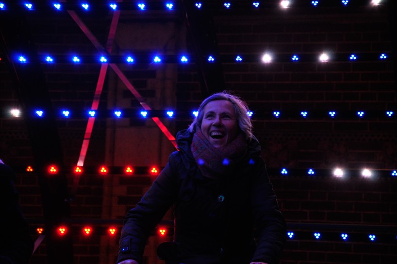 Mimoidoči se tako lahko v dveh ekipah po pet pomerijo v poganjanju koles, pri čemer s pedali prižigajo modre in rdeče luči na oboku ter izrisujejo živahni slap svetlobe iz ene strani na drugo. Edinstvena zabava, sponzorirana s strani podjetij InventDesign in DHL Express, je brezplačno na voljo vsak dan vse do 19. januarja.