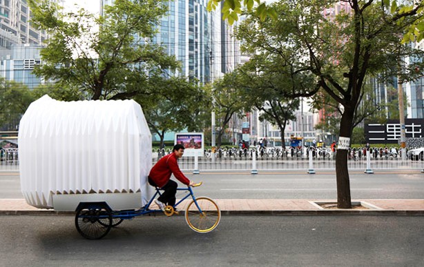 No, zdaj gremo pa že skoraj v skrajnosti. Dom, ki ga prevažate kar s kolesom? Tudi obstaja. Preprosto ga zložite kot harmoniko in se odpeljete naprej. Pa vseeno ima notri lijak, kuhalnik, kad in rezervoar za vodo. Ostalo pohištvo pa sproti prilagajate potrebam. Jedilna miza se lahko spremeni v posteljo, ko pa ne potrebujete ne ene ne druge, konstrukcijo preprosto postavite ob steno.