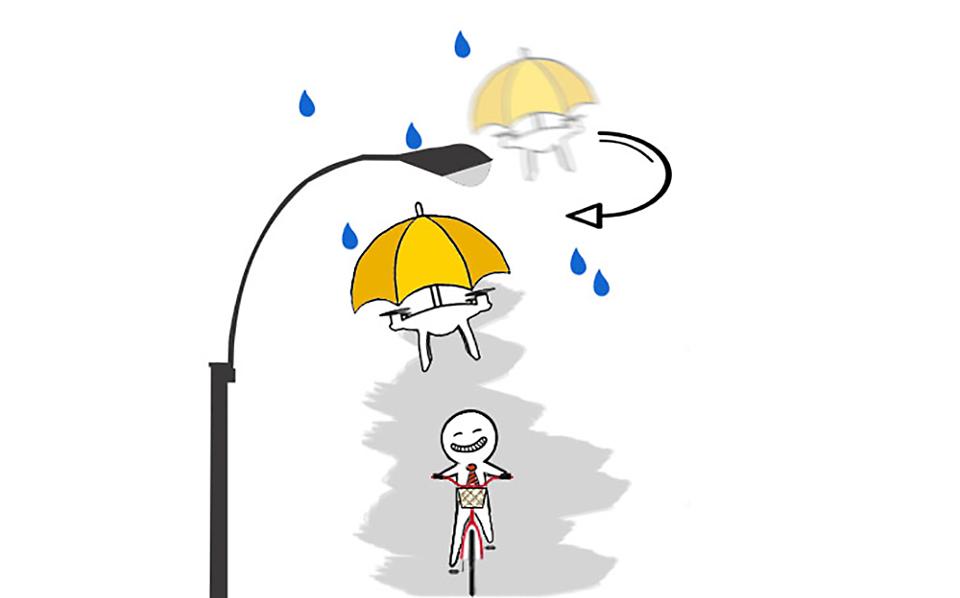 Držanje dežnika postaja preteklost. Če vas ドローン do zdaj še niso prepričali, se bo zahvaljujoč dronu Umbrella Drone (predelana različica drona DJI Phtanom 4) to spremenilo. Njegova naloga je prenašanje dežnika. Poleg kamere je namreč Drone Directs dron opremil še z dežnikom. Ta samodejno sledi posamezniku in vztraja nad njegovo glavo, najsi hodi, teče ali kolesari.