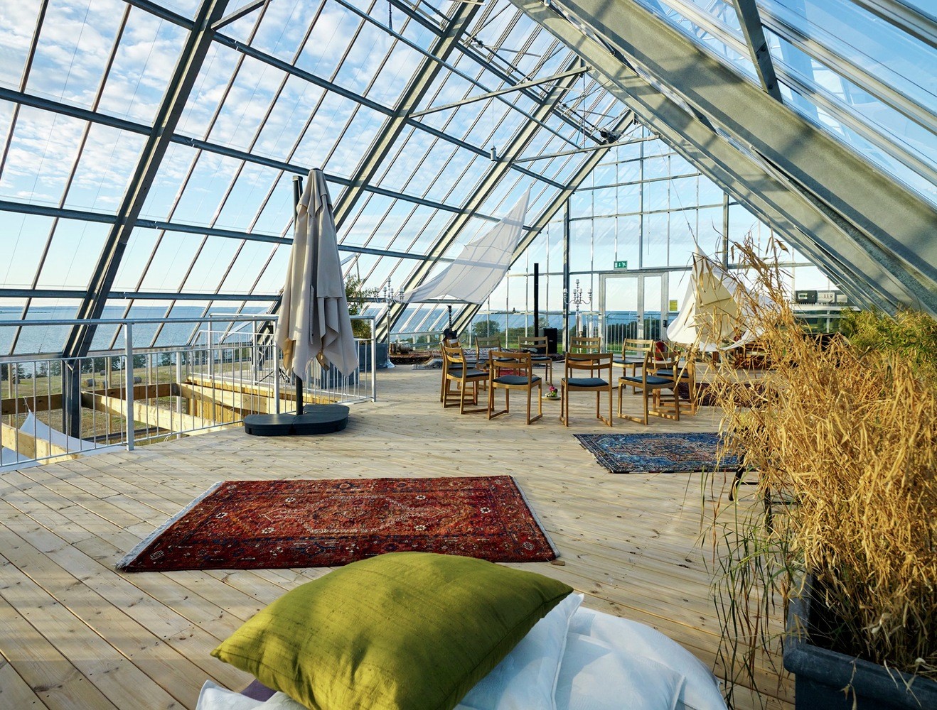 Jedilnica in skupni prostori so v lesenem mezzaninu, pod stekleno streho in na spodnji terasi, obdani z rastlinami, medtem ko sta スパ in soba za goste v pritličju, delno potopljenem v travnato površino.