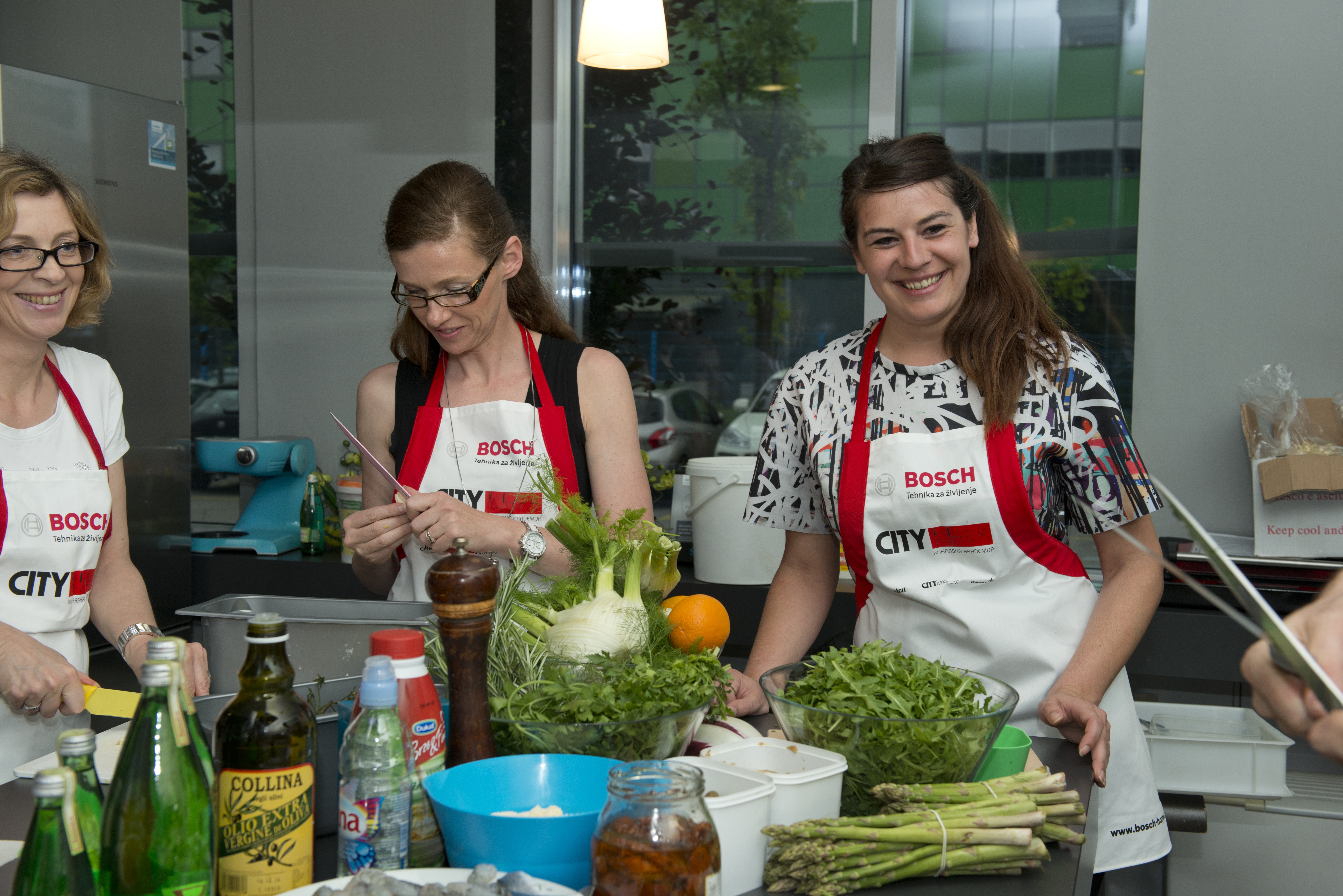 Glavne jedi je v prenovljenem salonu Bosch Siemens v Ljubljani pripravljal glavni kuhar Gostilnice in pizzerije Kaval, Dragan Marjanović, za sladke skrivnosti pa je poskrbel slaščičar iz Lolite, グレッグ・ロダ. Nepogrešljiv partner dobre hrane pa je vsekakor kozarec dobrega vina.