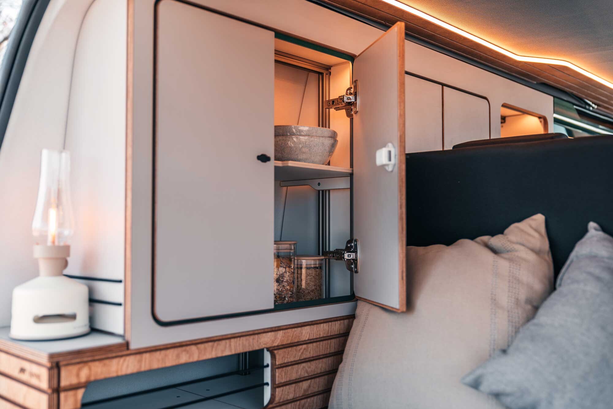 モーターホームの外観 キャニングキャノピー、周囲照明、最大 352 Wp の電力と供給を組み合わせるソーラーモジュールが装備されています。 1900Wh リチウム電池を使用しており、自給自足してオフグリッドでの動作が可能です。電流を220Vに変換するインバーターも利用できます。ラバーで包まれたグロスブラック仕上げの18インチABTホイールセットに乗っているとき グッドイヤー イーグル F1、装備全体が洗練さと冒険の雰囲気を醸し出しています。