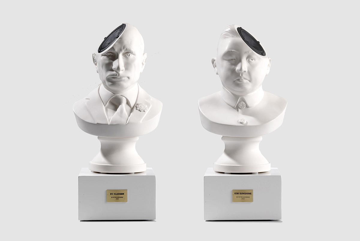 Bluetoothスピーカー The Sound of Power so delo Petra Wodkinsa. Na prvi pogled gre za doprsna kipa dveh kontroverznih osebnosti, voditelja Rusije Vladimirja Putina in voditelja Severne Koreje Kim Jong-Una, ko pogledamo pozorneje, pa ugotovimo, da gre za zvočnike, ki posnemajo videz doprsnih kipov iz marmorja.