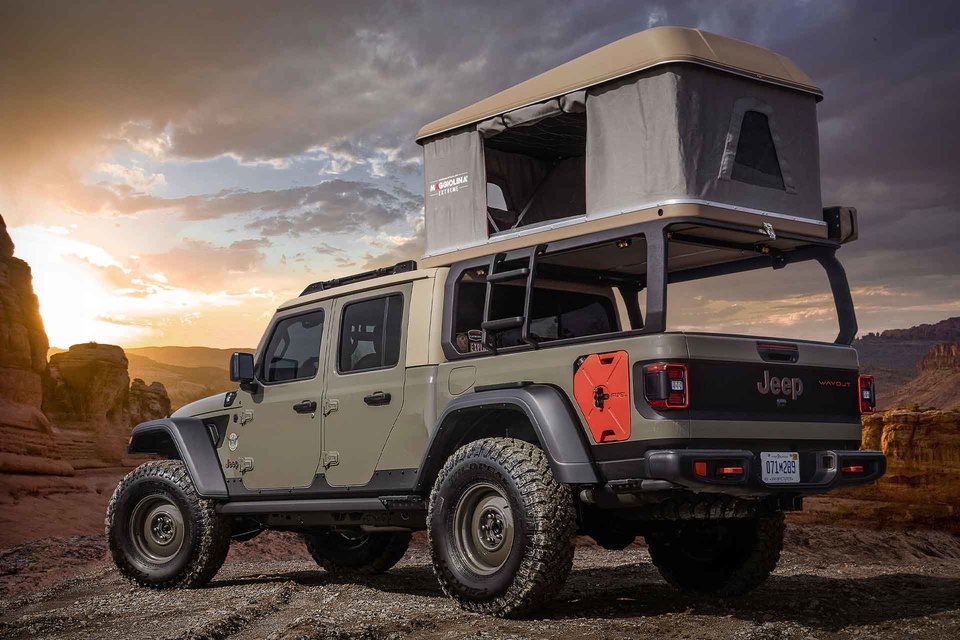 In tudi zato so predstavili koncept “wayout”, ki običajnega gladiatorja preobrazi v ultimativno počitniško vozilo, pravzaprav pravi mali avtodom za ekspedicije. Avto so nekoliko dvignili, ga postavili na 17-palčna jeklena kolesa v vojaškem slogu, opremljena s 37-palčnimi pnevmatikami za vse terene, ki poskrbijo, da lahko pridemo kamorkoli. Na strehi prtljažnega “kesona” se skriva postelja – oziroma strešni šotor, do katere vodi vgrajena lestev.