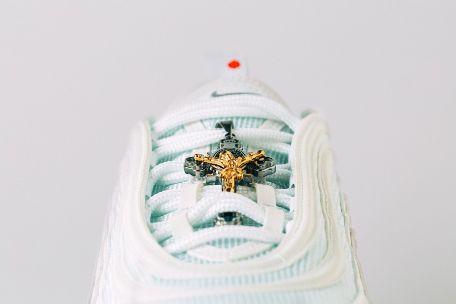 Digitalni kulturni studio MSCHF je v povezavi z versko simboliko in kultno privlačnostjo uličnega stila ustvaril “Jezusove superge”. V podplat superg Nike Air Max 97 so namreč vbrizgali 60 ml lahno obarvane posvečene oziroma svete vode iz reke Jordan, s čimer bi lahko vsak, ki si bi jih obul, dobesedno “hodil po vodi”. Čevlji, ustvarjeni z nekoliko ironično noto, s tem raziskujejo ideje o pobožnosti tako v religiji kot tudi pri komercialnih izdelkih.