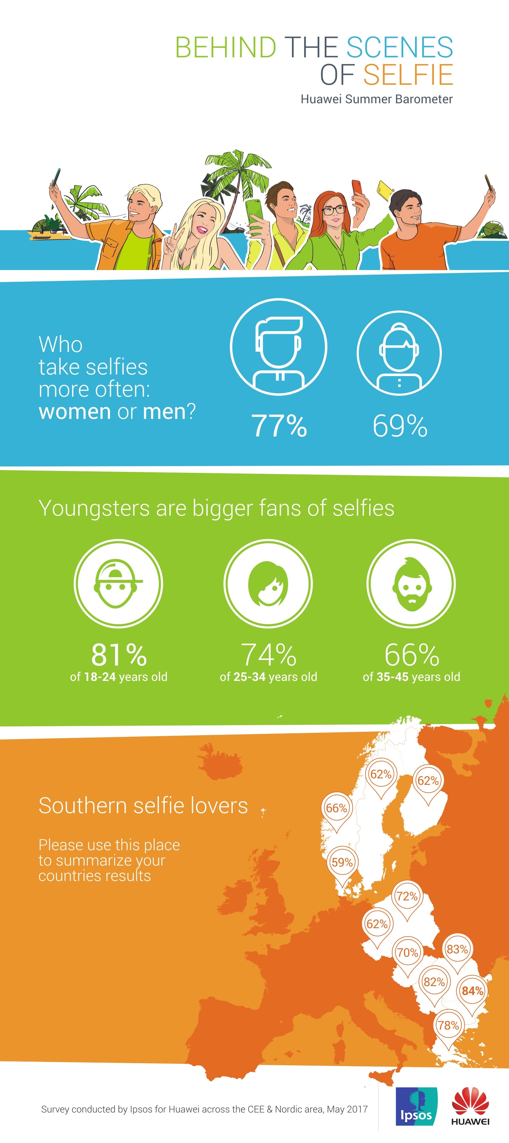 Huaweijev poletni barometer kaže tudi to, da nastane več selfijev med mlajšo populacijo. Vsi uporabniki pa vendarle niso enaki – podatki kažejo, da je v severni Evropi manj verjetno, da bo oseba delala selfije, to je namreč pogosteje v južnih državah – 84 odstotkov Bolgarov, 83 odstotkov Romunov, 82 odstotkov Srbov in 78 odstotkov Grkov. Po drugi strani pa selfiji niso tako popularni na Danskem, dela jih le 59 odstotkov, na Švedskem in Finskem 62 odstotkov.