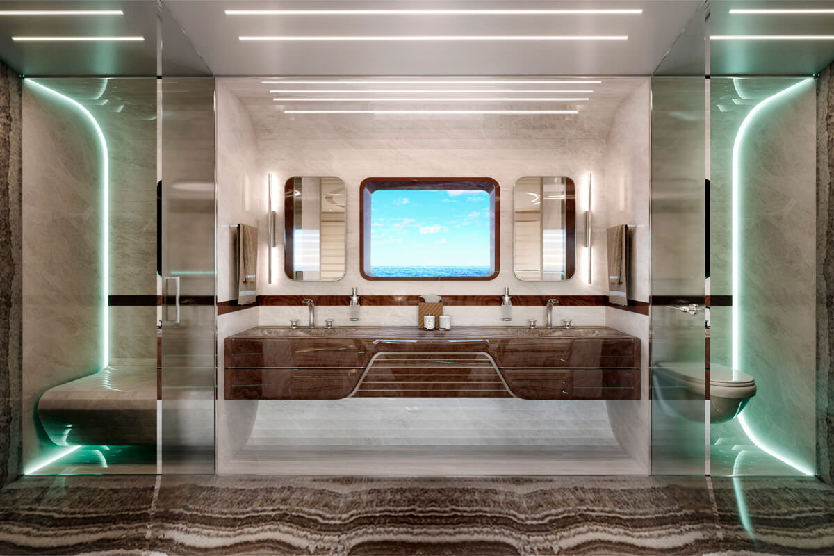 Znotraj vas čaka dobro opremljen salon in bar/ladijska kuhinja s pogledom na jahtin “beach club”, opremljen z zložljivimi pregradami in drsnimi steklenimi vrati, ki lahko goste izpostavijo sončnim žarkom ali pa varujejo pred sunki vetra. V spodnjem delu boste našli štiri kabine za goste in razkošno glavno spalnico, ki jo med drugim dopolnjujejo izvrstni oniks ter pohištvo iz kolekcije Bentley Home.