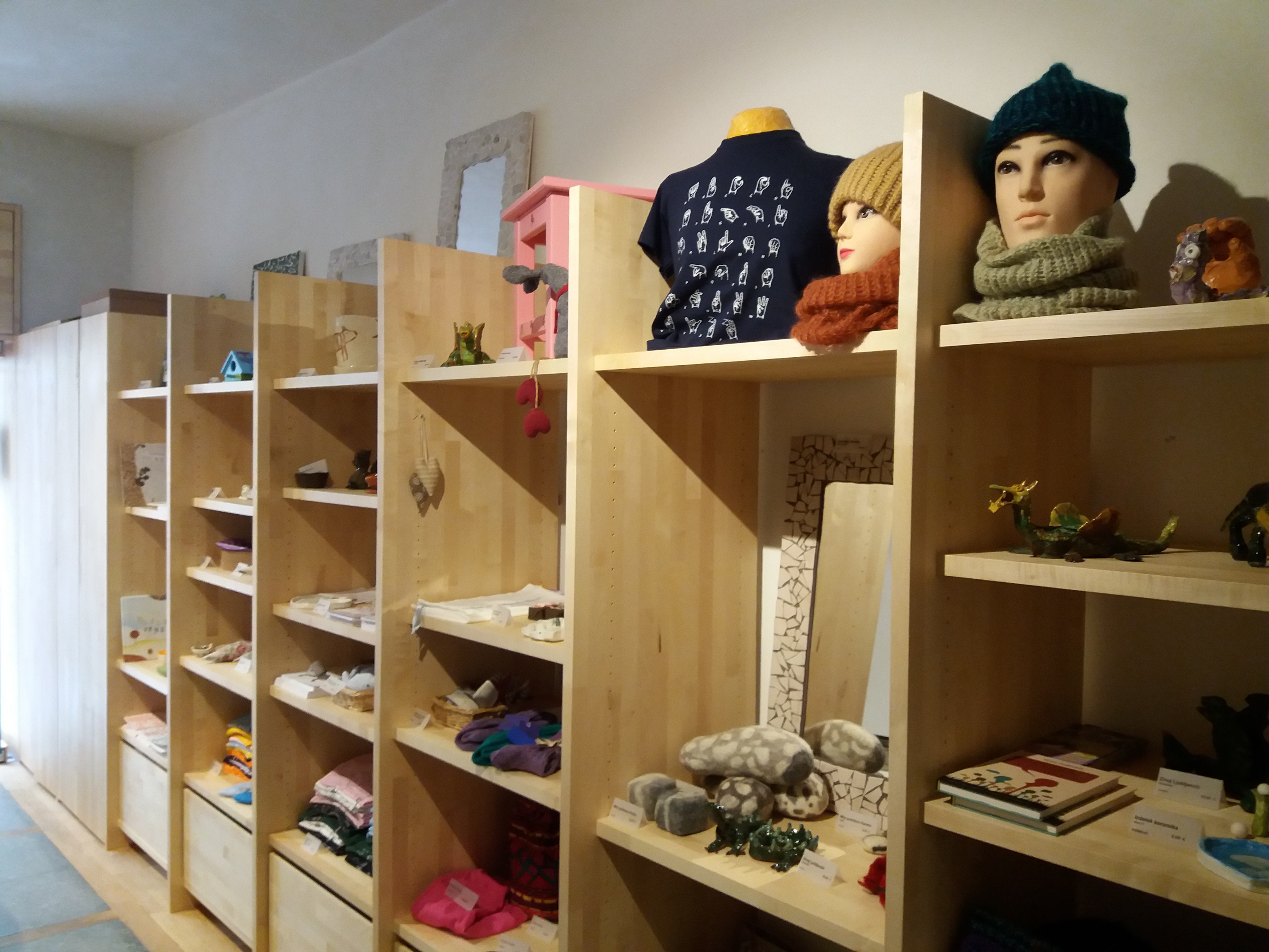 Kaj ponuja knjigarna-trgovinica Zebra gre na Luno? Izdelke, ki sproti nastajajo pri pouku in pri delovni terapiji tako na stopnji vrtca in osnovne šole kot tudi v okviru poklicnih usmeritev na srednji šoli. Ker teh izdelkov ni dovolj, je ZGN Ljubljana k sodelovanju povabil tudi mlade, ki so končali izobraževalno pot v njihovem zavodu (na področju računalništva, grafike, tiskarstva, tekstilstva, lesarstva in strojništva) in ki niso našli zaposlitve. V delavnicah omenjeni mladi pod mentorstvom mojstrov izdelujejo unikatne izdelke za opremo doma, spominke, vezane na Ljubljano in Slovenijo, umetniška in druga ročna dela ter še marsikaj drugega. V knjigarni-trgovinici ponujajo tudi strokovno literaturo, ki je nastala v njihovi ustanovi, v okviru delovanja Zveze društev gluhih in naglušnih Slovenije, v društvu Vilko Mazi in v Centru za sluh in govor Portorož – knjige, revije in časopise. Ponujala bo tudi literaturo drugih založb, ki obravnavajo vsebine iz življenja otrok s posebnimi potrebami.