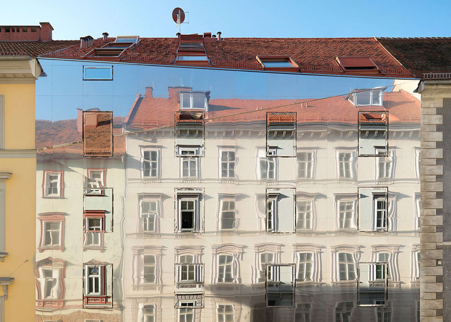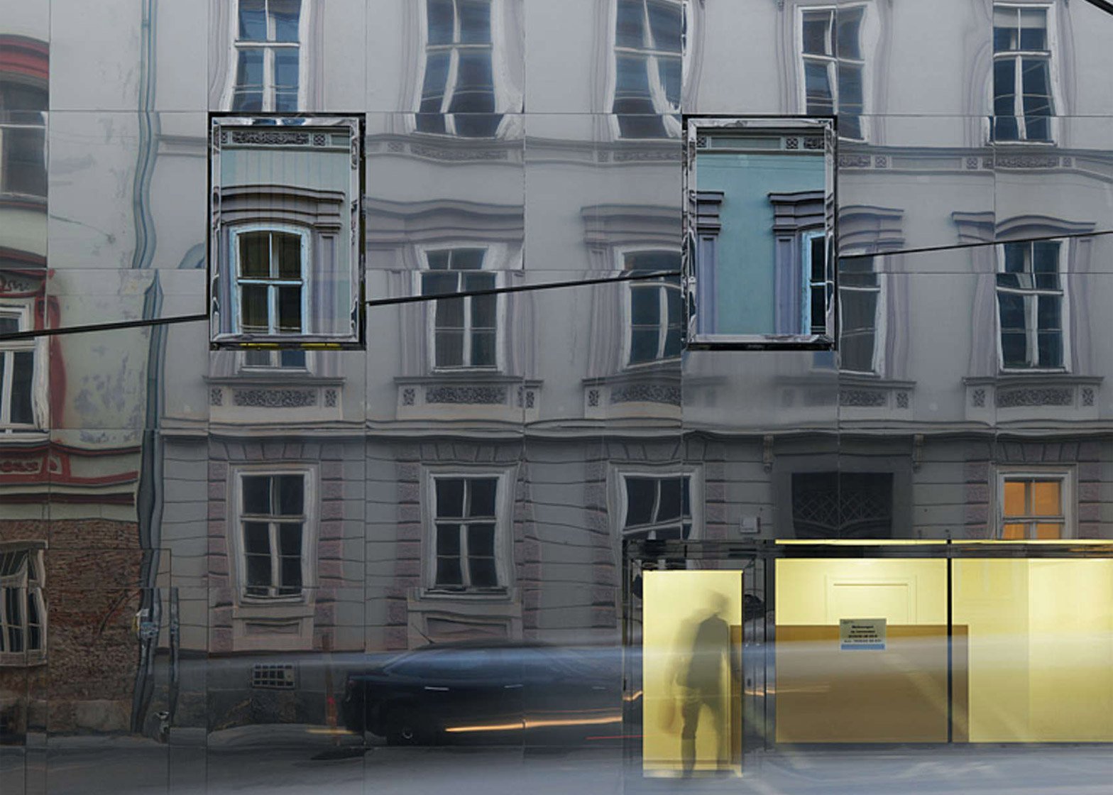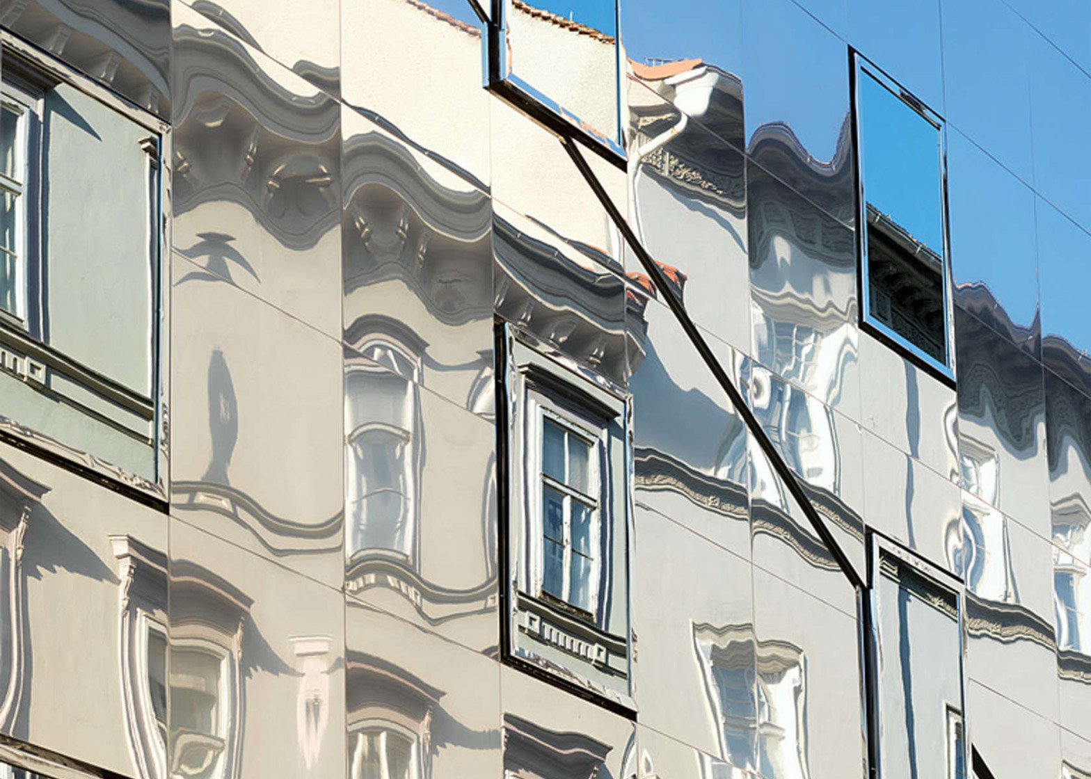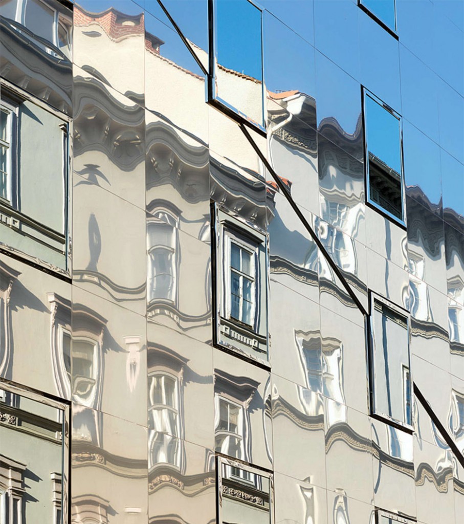 하지만 그들은 과거 시대의 건축 양식으로 건물을 짓는 대신, 그 건물을 지었습니다. 발하우스가세 덮인 거울과 함께우리가 보는 것 맞은편 건물의 반사그래서 정면 대신에 다른 정면을 가지고 있습니다. 이웃들.