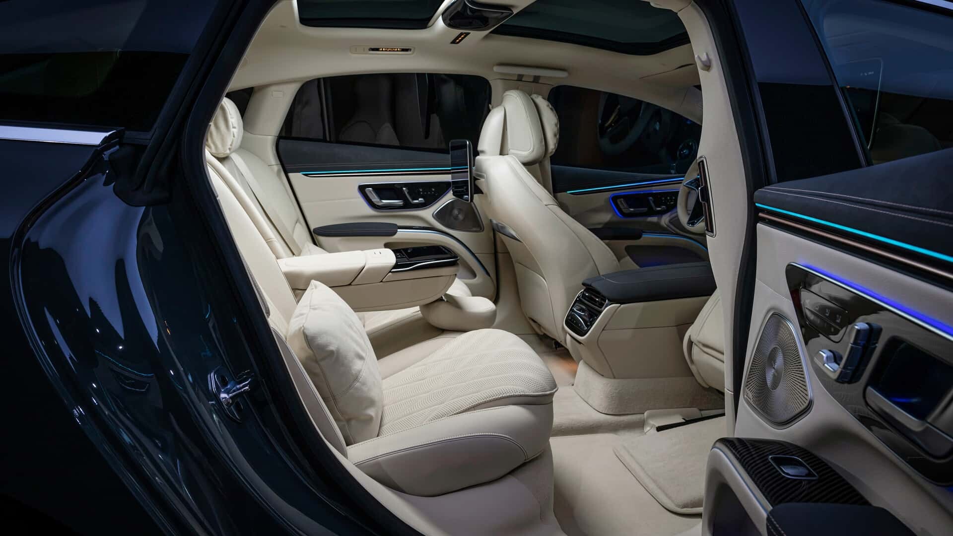 외부적인 변화뿐만 아니라 내부적인 변화도 인상적이다. 신형 EQS는 최대 38도까지 기울일 수 있는 시트, 추가 목 및 어깨 난방 장치, 공압식 뒷좌석 깊이 조절 기능이 포함된 '이그제큐티브 인테리어' 패키지로 최고 '피나클' 트림 레벨을 선택할 수 있습니다. 이 모든 것은 나파 가죽과 대비되는 스티치로 둘러싸여 있습니다.
