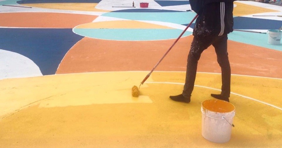 운동장 평소가 아니야 농구 코트. 예술가 게 여긴 낡은 놀이터야 이탈리아 알레산드리아에서 비슷하다 일스튜디오 그는 파리 9구에서 이를 예술적인 캔버스로 선택하여 부활시키고 미술품.