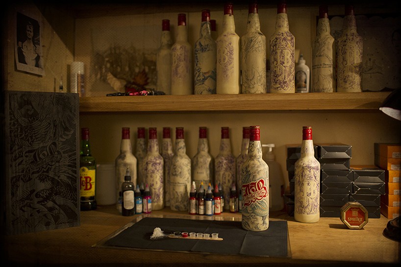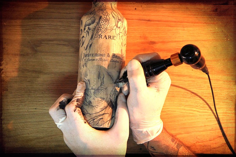 파리의 문신 스튜디오 소유자 스핑크스만이 세바스티앙 마티외 고귀한 음료의 인정받는 브랜드입니다 제이앤비 아주 특별한 모습을 연출했습니다. 그는 전기 바늘로 문신을 하는 현대 기술을 사용하여 내구성이 뛰어난 피부색 라텍스로 덮인 병을 장식했습니다. 다채롭고 극도로 사실적인 각 걸작을 완성하는 데 그는 20시간의 참을성 있는 작업이 필요했습니다.