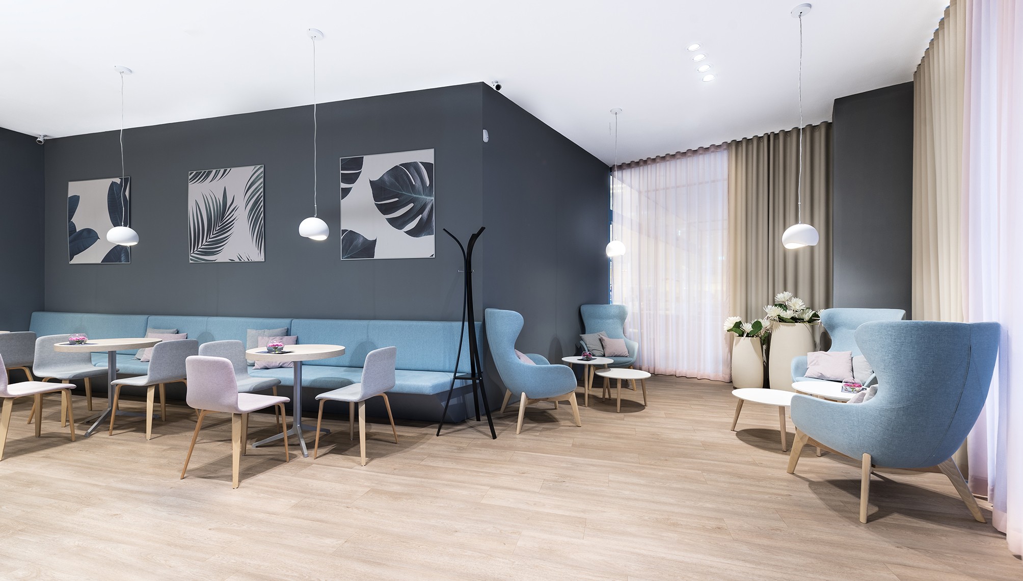 공간 자체는 카페의 중심으로 여겨지는 크고 둥근 카운터를 중심으로 디자인되었습니다. 창문 틈새에 있는 친밀한 미니 부스부터 반대편에 있는 편안하고 고급스러운 안락의자까지 사교 활동을 위한 다양한 코너가 주변에 배치되어 있습니다. 카페에서 가장 눈에 띄는 것 중 하나는 은은한 파스텔톤과 자연스러운 나무 그늘의 흥미로운 공생이다. 방 안의 나무는 집 같은 느낌을 주고, 절제된 파스텔 톤이 균형을 이루어 쾌적한 카페 분위기를 연출합니다. 부드럽게 둥근 형태의 가구는 1960년대를 연상시키며 모던한 인테리어에 복고풍 느낌을 더해줍니다. 여름에는 깨어나는 태양 광선을 부드럽게 감싸며 모닝 커피를 마시거나 쾌적한 오후 그늘에서 친구들과 "퇴근 후" 음료를 즐길 수 있는 넓은 여름 테라스가 있습니다.