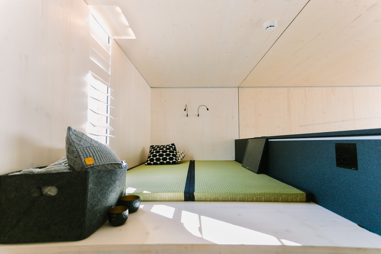 그것의 디자인에서 그것은 대략 더 작은 시설 2층으로. 메인 거실 공간에는 완비된 주방과 샤워 시설과 화장실이 있는 욕실이 있습니다. 침실은 1층에 있습니다.