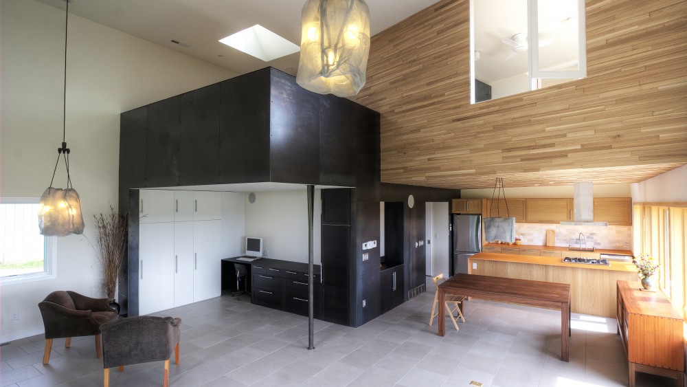 그 집은 다음 사람이 디자인했습니다. MU 아키텍처 현대 버전의 헛간처럼요. 집은 삼나무 판자와 짙은 회색 금속으로 덮여 있습니다.