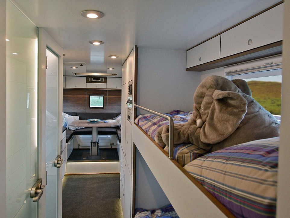 Action Mobil Globecruiser Family 7500 tehta kar 18 ton in ga lahko obremenimo še z dodatnimi 4.100 kilogrami. 길이로 측정됩니다 10미터 v višino pa 3,8 metra. Motor, ki poganja to premično domovanje, ima kar 540 konjskih moči, a kljub temu se lahko podate na daljšo pot, saj je gorivu namenjena 400-litrska posoda za gorivo. Na krovu je dovolj prostora za dve odrasli osebi 그리고 dva otroka, ki se jim ni treba bati žeje, saj je na kamionu shranjenih 1000 litrov vode. Če k temu dodamo še štiri 240-vatne sončne plošče 그리고 satelitsko televizijo se nam dolgčasa ali teme zagotovo ni treba bati. Globecruiser ima celo 바닥 난방, za hlajenje in gretje prostora pa skrbita dve klimatski napravi z močjo 2400 vatov.