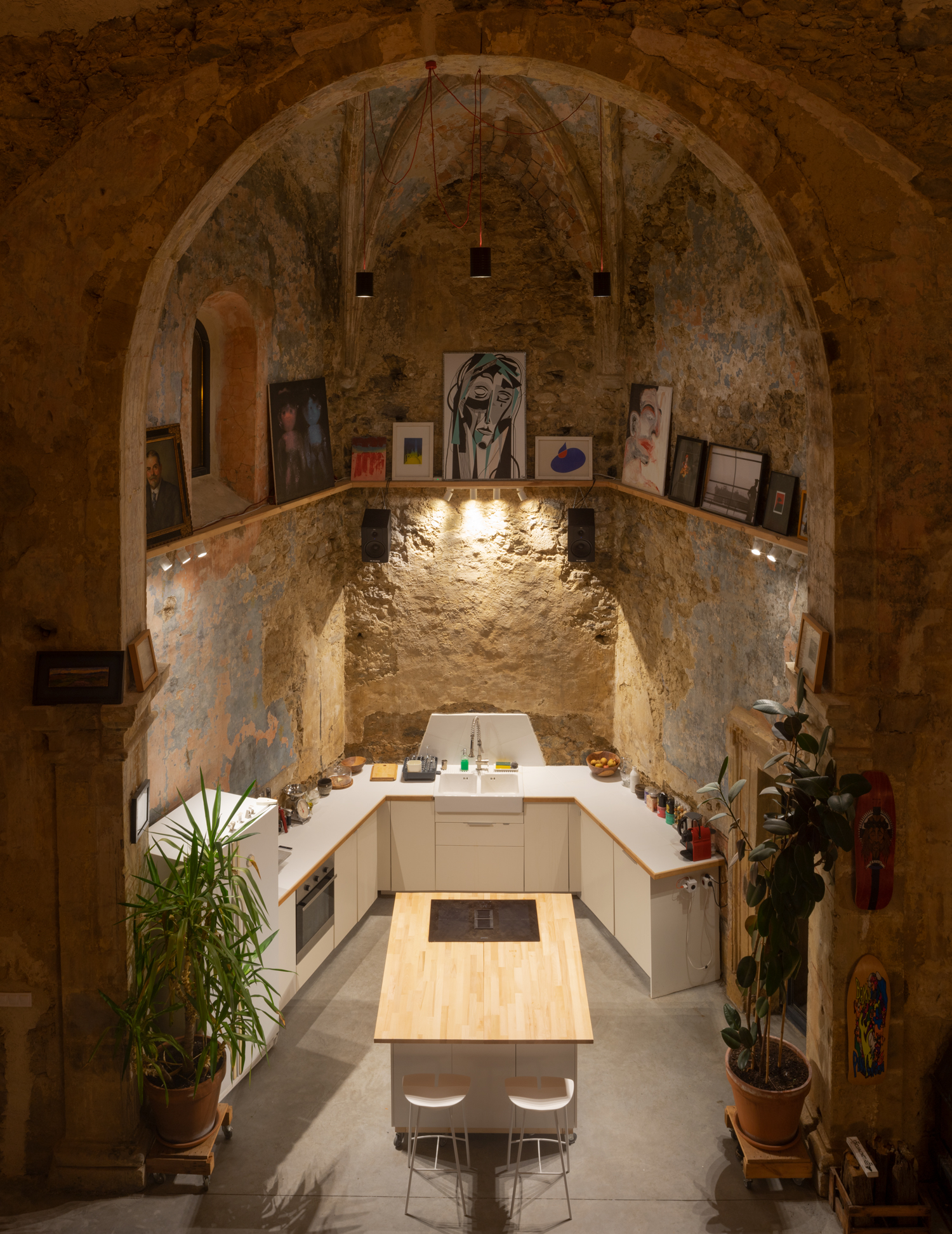 Nad dvema tretjinama hiše je 10 metrov visok strop, kjer sta jedilnica in dnevna soba kot osrednji del in kuhinja v polkrogu – na mestu nekdanjega oltarja. V tem skupnem prostoru je tudi velik kamin na drva.