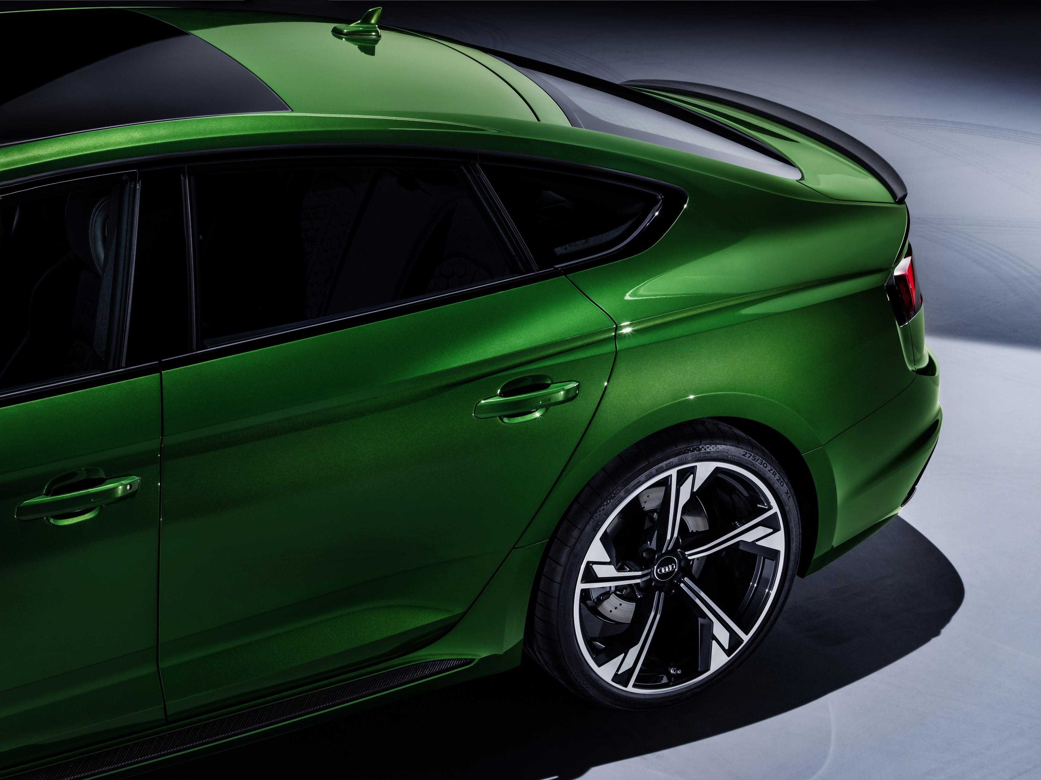 Zaradi dolge medosne razdalje in kratkih previsov je drža Audija RS5 Sportback športna in agresivna, še dodatno pa jo poudarijo kovana 19인치 platišča, ki jih po želji lahko nadgradimo z 20인치짜리 kovanimi platišči. Dodatno si lahko omislimo še paket zunanjih elementov v karbonski, svetleče črni ali matirano aluminijasti izvedbi. Strupena sonomsko zelena barva je na voljo 독점적인 za športne modele RS5.