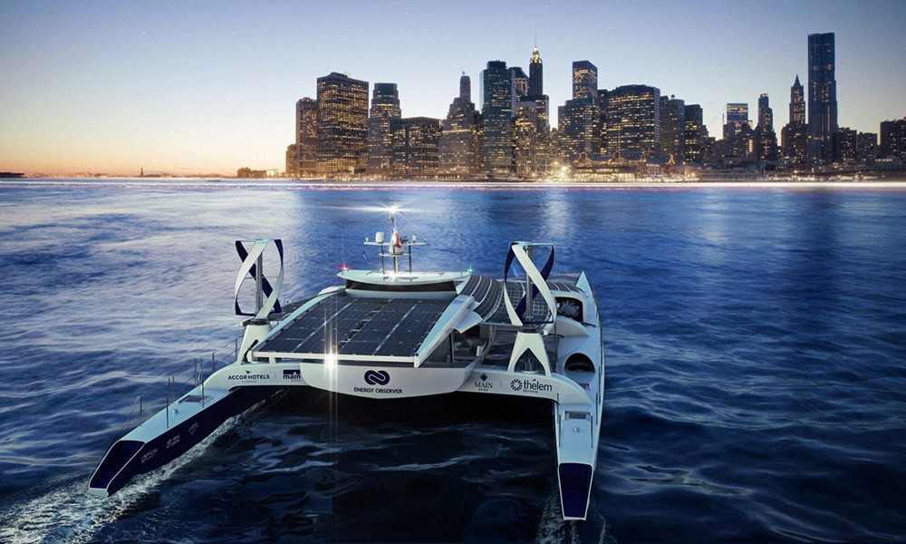 Katamaran Energy Observer bo nekakšen laboratorij na prostem, namenjen brezemisijskemu raziskovanju, v naslednjih šestih letih pa se bo ustavil v 50 državah in 101 pristanu. V dolžino meri 30미터 in je širok 12,8 metra. Odet je v 130 kvadratnih metrov solarnih panelov, 가지다 dve vetrni turbini ter opremo za elektrolizo, ki s pridobljeno energijo ustvarja 수소.