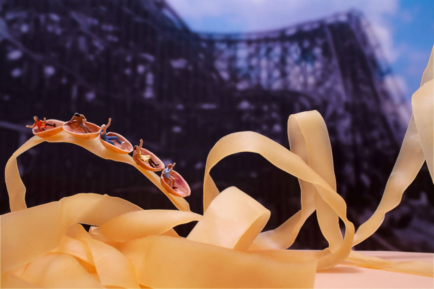 Za nekatere je ustvarjanje v kuhinji nekaj vsakdanjega in avtomatičnega. Kdo drug je nad kulinaričnim udejstvovanjem tako zelo navdušen, da v kuhanju najde priložnost za umetniško ustvarjanje. Igranje s hrano je tokrat doživelo nove razsežnosti, saj so sočni sadeži, hrustljava zelenjava in slastne testenine navdušile brazilskega umetnika Williama Kassa v tolikšni meri, da je iz njih ustvaril pravcati nadrealni svet. V seriji z naslovom “Minimize-Food” je namreč miniaturne človeške figurice postavil v svet, ki ga je sestavil iz hrane. Sadje, zelenjava, testenine, sladoled in še kaj v seriji fotografij sestavljajo odlično kuliso in prav posebno scenografijo. Še en dokaz, da je z nekaj domišljije možno vse!