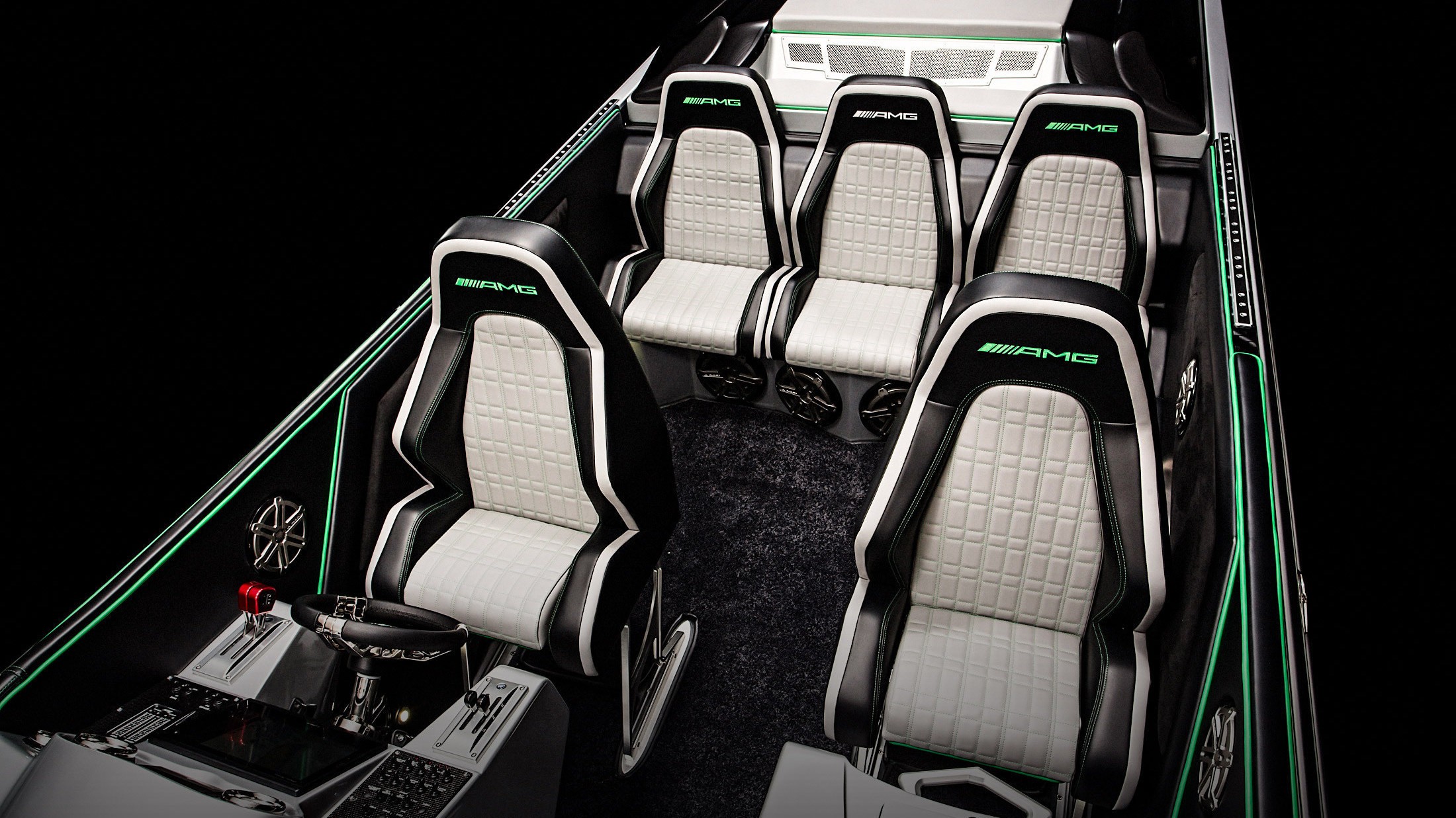 시가렛 레이싱 팀의 50피트 마라우더 AMG 스피드보트는 다임러의 수석 디자이너가 설계했습니다. 고든 와게너, AMG 퍼포먼스 그리고 흥미로운 좌석에 서명했습니다. 탄소 섬유 사용 덕분에 이 고속정은 약 100% 정도 무게가 줄었습니다. 600킬로그램엔진 해치, 조종석, 갑판 및 콘솔 등은 이 소재로 만들어졌습니다. 이 함선은 두 개의 첨단 엔진으로 구동됩니다. 머큐리 레이싱, 3100마력이를 통해 다양한 전력 레벨 간에 전환할 수 있습니다. 모드 즈크 바지 1500마력의 출력을 낼 수 있지만, 특수 장비가 필요합니다. 레이싱 연료'즐거움' 모드 (기쁨이 보트는 특히 1350마력의 출력을 자랑합니다. 이 고속 보트의 가격은 공개되지 않았습니다.