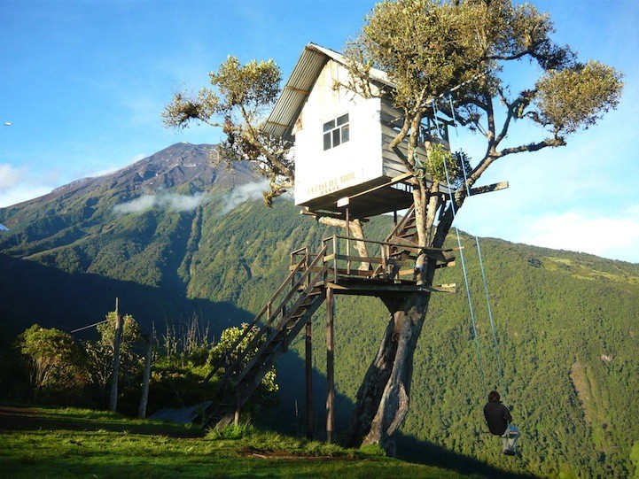 ”Casa del arbol” ali hišica na drevesu je majhna lesena hišica na drevesu v ekvadorskem Baňosu. Na njej je držalo, ki drži gugalnico (zdi se precej tanka) za pogumne.