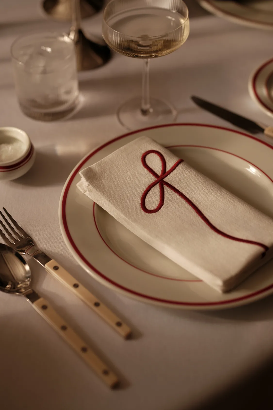 붉은 테두리의 도자기가 테이블 위를 장악합니다. 접시부터 볼까지, 섬세한 크리스마스 슬로건이 새겨져 있습니다. 튤립 모양의 크롬과 황동 촛대에는 세 가지 크기의 촛불이 켜져 있으며, 셰프의 식탁 중앙에 놓기에 더욱 돋보이는 드라마틱한 촛대도 옵션으로 제공됩니다.