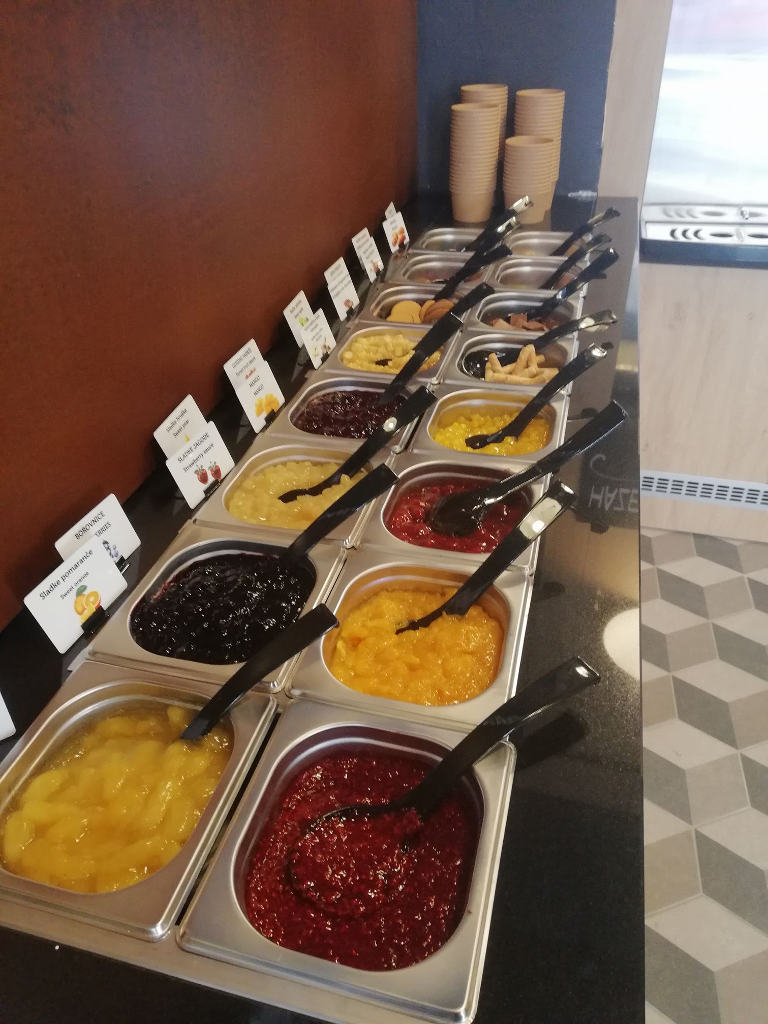Princip samopostrežne sladolednice omogoča, da si stranka sama izbere lonček ali kornet, si naroči vaflje/mini palačinke/ameriške krofe in doda dodatke po želji, postavi na tehtnico, plača in uživa.