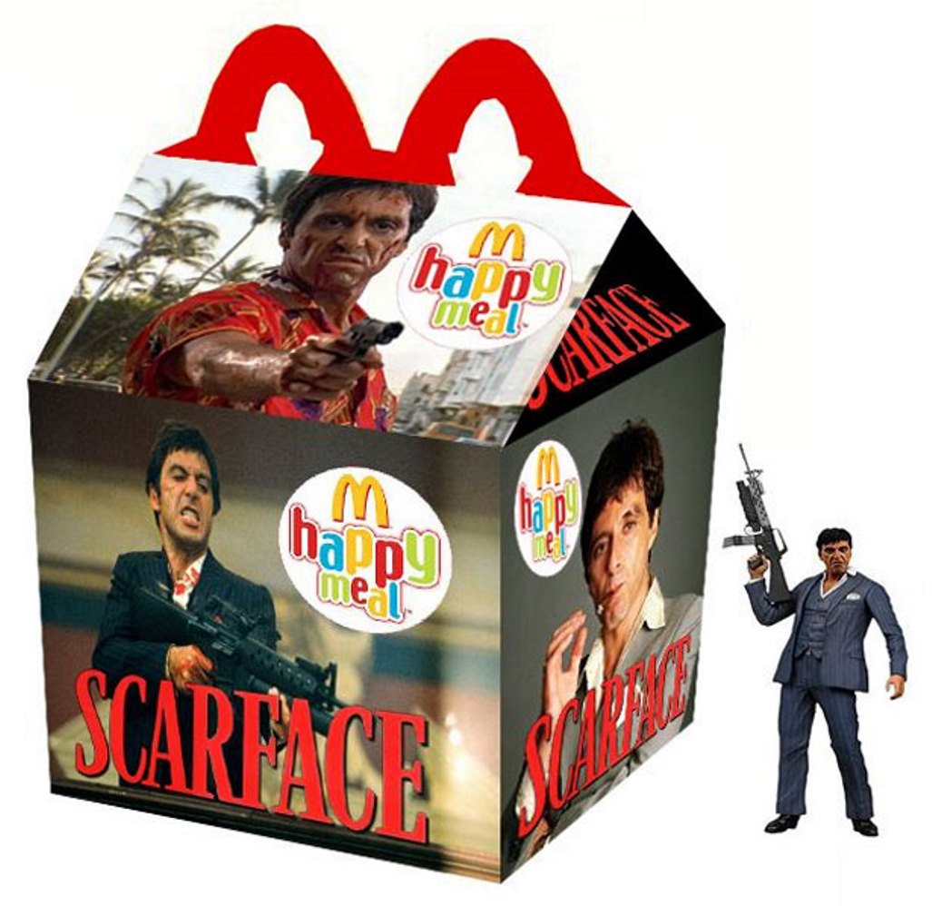 Nostalgična ideja je prešinila umetnika Newta Clementsa, ki si je zamislil zamenjati klasične embalaže hitre prehrane, z nepozabnimi ikonami večnih filmskih in televizijskih uspešnic, ki so oblikovale naša filmska doživetja. Akcijske figure, pištole in celo imitacija metamfetamina iz televizijske serije Breaking Bad, so vrste ‘’igrač’’, ki seveda niso primerne za otrokov Happy Meal.