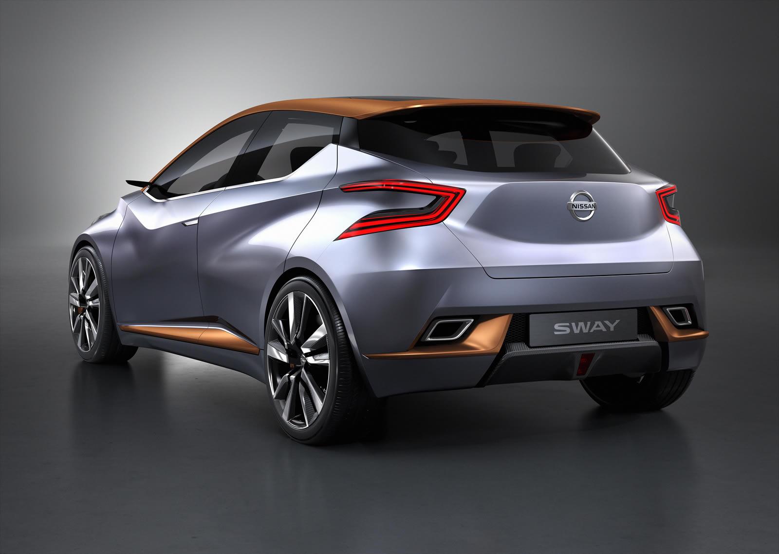 일부 "티저" 사진 이후 Nissan은 차세대 닛산 마이크가 어떤 모습일 수 있는지 제안하는 현대 도시 자동차에 대한 연구를 발표하고 발표했습니다. 닛산 스웨이는 첨단 기둥 없는 디자인과 도어 투 도어 개방 기능을 제공합니다. 날카로운 선, 팽창된 후드, 스포티한 범퍼 및 두 개의 대형 사다리꼴 배기 "트럼펫" 형태의 후면 마감이 특징입니다.